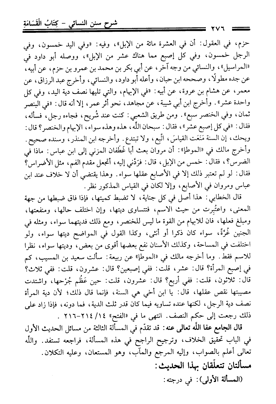 قَالَ الخطّابيّ: هَذَا أصل فِي كل جناية، لا تضبط كميتها، فإذا فاق ضبطها منْ جهة المعنى، واعتُبِرت منْ حيث الاسم، فتتساوى ديتها، وإن اختلف حالها، ومنفعتها، ومبلغ فعلها، فان للابهام منْ القوة ما ليس للخنصر، ومع ذلك فديتهما سواء، ومثله فِي الجنين غُرَّةٌ، سواء كَانَ ذكرا أو أنثى، وكذا القول فِي المواضح ديتها سواء، ولو اختلفت فِي المساحة، وكذلك الأسنان نفع بعضها أقوى منْ بعض، وديتها سواء، نظرا للاسم فقط. وما أخرجه مالك فِي "الموطإ" عن ربيعة: سألت سعيد بن المسيب، كم فِي إصبع المرأة؟ قَالَ: عشر، قلت: ففي إصبعين؟ قَالَ: عشرون، قلت: ففي ثلاث؟ قَالَ: ثلاثون، قلت: ففي أربع؟ قَالَ: عشرون، قلت: حين عَظُم جُرْحها، واشتدت مصيبتها نقص عقلها، قَالَ: يا ابن أخي هي السنة، فإنما قَالَ ذلك؛ لأن دية المرأة نصف دية الرجل، كنها عنده تساويه فيما كَانَ قدر ثلث الدية، فما دونه، فإذا زاد عَلَى ذلك رجعت إلى حكم النصف. انتهى ما فِي "الفتح" 14/ 214 - 216.