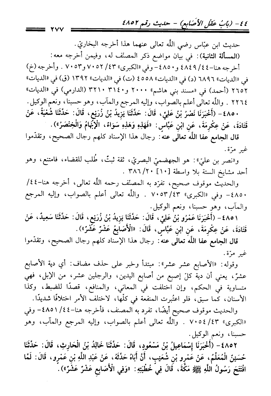 4851 - (أَخْبَرَنَا عَمْرُو بْنُ عَلِيٍّ، قَالَ: حَدَّثَنَا يَزِيدُ بْنُ زُرَيْعٍ، قَالَ: حَدَّثَنَا سَعِيدٌ، عَنْ قَتَادَةَ، عَنْ عِكْرِمَةَ، عَنِ ابْنِ عَبَّاسٍ، قَالَ: "الأَصَابِعُ عَشْرٌ عَشْرٌ").