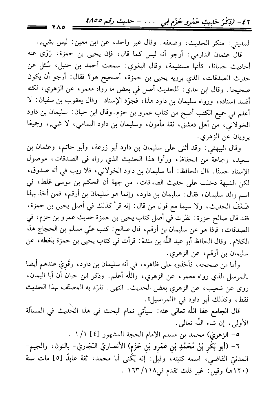 وَقَالَ البيهقي: وَقَدْ أثنى عَلَى سليمان بن داود أبو زرعة، وأبو حاتم، وعثمان بن سعيد، وجماعة منْ الحفاظ، ورأوا هَذَا الْحَدِيث الذي رواه فِي الصدقات، موصول الإسناد حسنًا. قَالَ الحافظ: أما سليمان بن داود الخولاني، فلا ريب فِي أنه صدوقٌ، لكن الشبهة دخلت عَلَى حديث الصدقات، منْ جهة أن الحكم بن موسى غلط، فِي اسم والد سليمان، فَقَالَ: سليمان بن داود، وإنما هو سليمان بن أرقم، فمن أخذ بهذا ضَعَّفَ الْحَدِيث، ولاسيما مع قول منْ قَالَ: إنه قرأ كذلك فِي أصل يحيى بن حمزة، فقد قَالَ صالح جزرة: نظرت فِي أصل كتاب يحيى بن حمزة حديثَ عمرو بن حزم، فِي الصدقات، فإذا هو عن سليمان بن أرقم، قَالَ صالح: كتب عنّي مسلم بن الحجاج هَذَا الكلام. وَقَالَ الحافظ أبو عبد الله بن مندهْ: قرأت فِي كتاب يحيى بن حمزة بخطه، عن سليمان بن أرقم، عن الزهري.