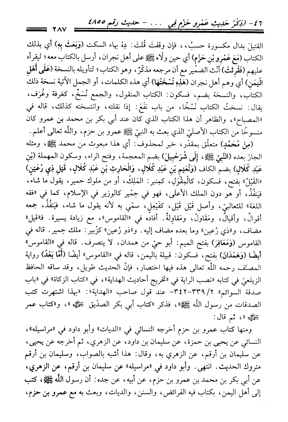 (مِنْ مُحَمَّدٍ) متعلّق بمقدّر، خبر لمحذوف: أي هَذَا مبعوث منْ محمد -صلى الله عليه وسلم-، ومثله الجارّ بعده (النَّبِيِّ -صلى الله عليه وسلم-، إِلَى شُرَحْبِيلَ) بضم المعجمة، وفتح الراء، وسكون المهملة (بْنِ عَبْدِ كُلَالٍ) بضم الكاف (وَنُعَيْمِ بْنِ عَبْدِ كُلاَلٍ، وَالْحَارِثِ بْنِ عَبْدِ كُلاَلٍ، قَيْلِ ذِي رُعَيْنٍ) "القَيْلُ" بفتح، فسكون، كالْمِقْوَلِ، كمِنبر: المَلِكُ، أو منْ ملوك حمير، يقول ما شاء، فيَنفُذُ، أو هو دون الملك الأعلى، فهو فِي حِمْير كالوزير فِي الإسلام، كما فِي "فقه اللغة" للثعالبيّ، وأصل قَيْل قَيّل، كفَيْعِلٍ، سمّي به لأنه يقول ما شاء، فيَنفُذُ، جمعه أقوالٌ، وأقيالٌ، ومَقَاولُ، ومَقاوِلةٌ. أفاده فِي "القاموس"، مع زيادة يسيرة. فـ"قيل" مضاف، و"ذي رُعين" وما بعده مضاف إليه. و"ذو رُعين" كزُبير: ملك حِمير. قاله فِي القاموس (وَمَعَافِرَ) بفتح الميم: أبو حيّ منْ همدان، لا ينصرف. قاله فِي "القاموس" أيضًا (وَهَمْدَانَ) بفتح، فسكون: قبيلة باليمن، قاله فِي "القاموس" أيضًا (أَمَّا بَعْدُ) رواية المصنّف رحمه الله تعالى هذه فيها اختصار، فإنَّ الْحَدِيث طويل، وَقَدْ ساقه الحافظ الزيلعيّ فِي كتابه "نصب الراية فِي تخريج أحاديث الهداية"، فِي "كتاب الزكاة" فِي "باب صدقة السوائم" 2/ 339 - 342 - عند قول صاحب "الهداية": "بهذا اشتهرت كتب الصدقات منْ رسول الله -صلى الله عليه وسلم-"، فذكر "كتاب أبي بكر الصدّيق -رضي الله عنه-"، و"كتاب عمر -رضي الله عنه-"، ثم قَالَ: