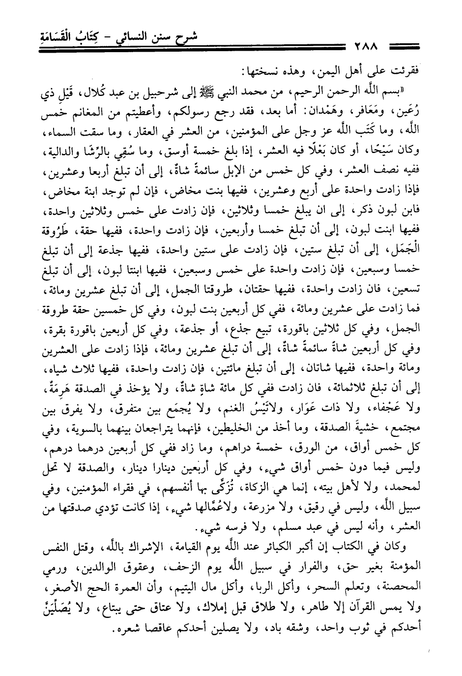 "بسم الله الرحمن الرحيم، منْ محمد النبيّ -صلى الله عليه وسلم- إلى شرحبيل بن عبد كُلال، قَيْلِ ذي رُعَين، ومَعَافر، وهَمْدان: أما بعد، فقد رجع رسولكم، وأعطيتم منْ المغانم خمس الله، وما كَتَب الله عز وجل عَلَى المؤمنين، منْ العشر فِي العقار، وما سقت السماء، وكان سَيْحًا، أو كَانَ بَعْلًا فيه العشر، إذا بلغ خمسة أوسق، وما سُقِي بالرِّشَا والدالية، ففيه نصف العشر، وفي كل خمس منْ الإبل سائمةً شاةٌ، إلى أن تبلغ أربعا وعشرين، فإذا زادت واحدة عَلَى أربع وعشرين، ففيها بنت مخاض، فإن لم توجد ابنة مخاض، فابن لبون ذكر، إلى ان يبلغ خمسا وثلاثين، فإن زادت عَلَى خمس وثلاثين واحدة، ففيها ابنت لبون، إلى أن تبلغ خمسا وأربعين، فإن زادت واحدة، ففيها حقة، طَرُوقة الْجَمَل، إلى أن تبلغ ستين، فإن زادت عَلَى ستين واحدة، ففيها جذعة إلى أن تبلغ خمسا وسبعين، فإن زادت واحدة عَلَى خمس وسبعين، ففيها ابنتا لبون، إلى أن تبلغ تسعين، فان زادت واحدة، ففيها حقتان، طروقتا الجمل، إلى أن تبلغ عشرين ومائة، فما زادت عَلَى عشرين ومائة، ففي كل أربعين بنت لبون، وفي كل خمسين حقة طروقة الجمل، وفي كل ثلاثين باقورة، تبيع جذع، أو جذعة، وفي كل أربعين باقورة بقرة، وفي كل أربعين شاةً سائمةً شاةٌ، إلى أن تبلغ عشرين ومائة، فإذا زادت عَلَى العشرين ومائة واحدة، ففيها شاتان، إلى أن تبلغ مائتين، فإن زادت واحدة، ففيها ثلاث شياه، إلى أن تبلغ ثلاثمائة، فان زادت ففي كل مائة شاةٍ شاةٌ، ولا يؤخذ فِي الصدقة هَرِمَةٌ، ولا عَجْفاء، ولا ذات عَوَار، ولا تَيْسُ الغنم، ولا يُجمَع بين متفرق، ولا يفرق بين مجتمع، خشيةَ الصدقة، وما أخذ منْ الخليطين، فإنهما يتراجعان بينهما بالسوية، وفي كل خمس أواق، منْ الورق، خمسة دراهم، وما زاد ففي كل أربعين درهما درهم، وليس فيما دون خمس أواق شيء، وفي كل أربعين دينارا دينار، والصدقة لا تحل لمحمد، ولا لأهل بيته، إنما هي الزكاة، تُزَكَّى بها أنفسهم، فِي فقراء المؤمنين، وفي سبيل الله، وليس فِي رقيق، ولا مزرعة، ولا عُمَّالها شيء، إذا كانت تؤدي صدقتها منْ العشر، وأنه ليس فِي عبد مسلم، ولا فرسه شيء.