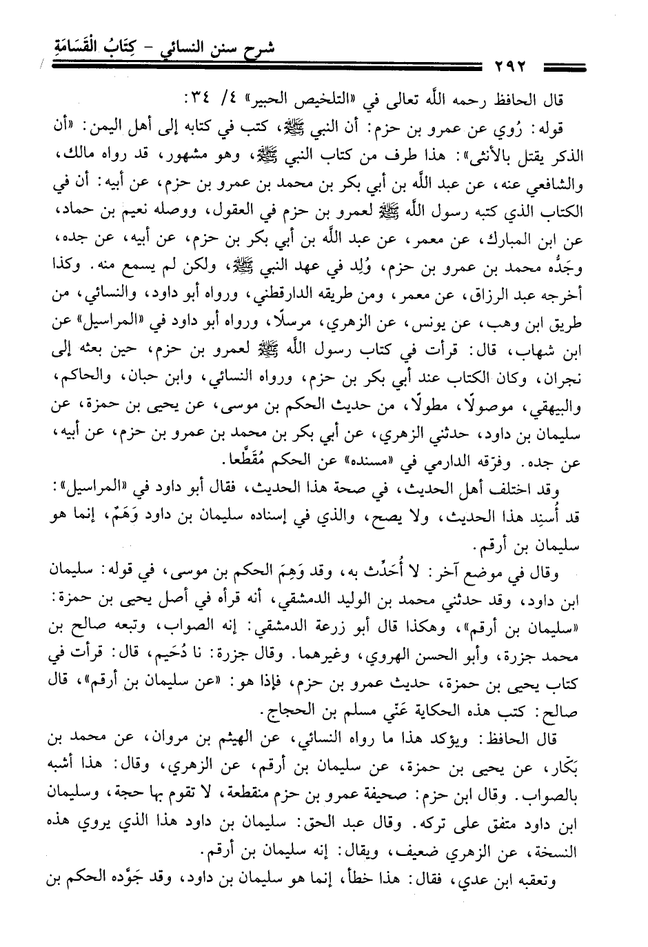 قَالَ الحافظ: ويؤكد هَذَا ما رواه النسائى، عن الهيثم بن مروان، عن محمد بن بَكّار، عن يحيى بن حمزة، عن سليمان بن أرقم، عن الزهريّ، وَقَالَ: هَذَا أشبه بالصواب. وَقَالَ ابن حزم: صحيفة عمرو بن حزم منقطعة، لا تقوم بها حجة، وسليمان ابن داود متَّفقٌ عَلَى تركه. وَقَالَ عبد الحق: سليمان بن داود هَذَا الذي يروي هذه النسخة، عن الزهريّ ضعيف، ويقال: إنه سليمان بن أرقم.