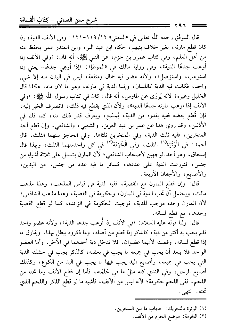 قَالَ الموفّق رحمه الله تعالى فِي "المغني" 12/ 119 - 121: وفي الأنف الدية، إذا كَانَ قطع مارنه، بغير خلاف بنيهم، حكاه ابن عبد البرّ، وابن المنذر عمن يحفظ عنه منْ أهل العلم، وفي كتاب عمرو بن حزم، عن النبيّ -صلى الله عليه وسلم-، أنه قَالَ: "وفي الأنف إذا أُوعب جدعًا الدية"، وفي رواية مالك فِي "الموطإ": "إذا أُوعِي جدعًا -يعني إذا استوعب، واستؤصل"، ولأنه عضو فيه جمال ومنفعة، ليس فِي البدن منه إلا شيء واحد، فكانت فيه الدية كاللسان، وإنما الدية فِي مارنه، وهو ما لان منه، هكذا قَالَ الخليل وغيره؛ لأنه يُروَى عن طاوس، أنه قَالَ: كَانَ فِي كتاب رسول الله -صلى الله عليه وسلم-: "وفي الأنف إذا أوعب مارنه جدعًا الدية"، ولأن الذي يقطع فيه ذلك، فانصرف الخبر إليه، فإن قُطع بعضه ففيه بقدره منْ الدية، يُمسَح، ويعرف قدر ذلك منه، كما قلنا فِي الأذنين، وَقَدْ روي هَذَا عن عمر بن عبد العزيز، والشعبي، والشافعي، وإن قطع أحد المنخرين، ففيه ثلث الدية، وفي المنخرين ثلثاها، وفي الحاجز بينهما الثلث، قَالَ أحمد: فِي الْوَتَرَة (¬1) الثلث، وفي الْخَرَمَة (¬2) فِي كل واحد منهما الثلث، وبهذا قَالَ إسحاق، وهو أحد الوجهين لأصحاب الشافعيّ؛ لأن المارن يشتمل عَلَى ثلاثة أشياء منْ جنس، فتوزعت الدية عَلَى عددها، كسائر ما فيه عدد منْ جنس، منْ اليدين، والأصابع، والأجفان الأربعة.