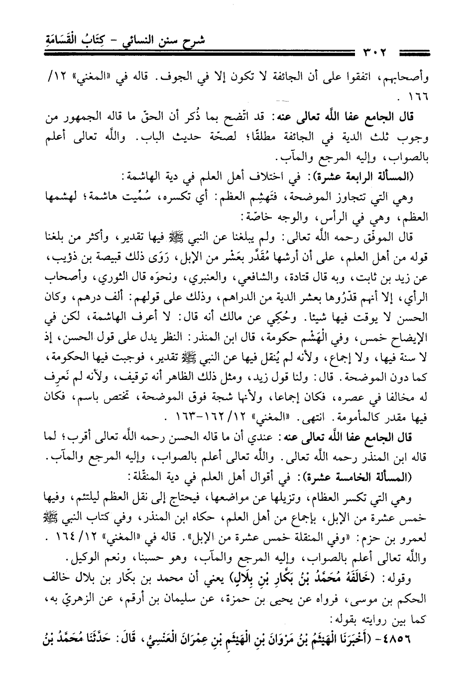 قَالَ الموفّق رحمه الله تعالى: ولم يبلغنا عن النبيّ -صلى الله عليه وسلم- فيها تقدير، وأكثر منْ بلغنا قوله منْ أهل العلم، عَلَى أن أرشها مُقَدَّر بعَشْر منْ الإبل، رَوَى ذلك قبيصة بن ذؤيب، عن زيد بن ثابت، وبه قَالَ قتادة، والشافعي، والعنبري، ونحوَه قَالَ الثوري، وأصحاب الرأي، إلا أنهم قدّرُوها بعشر الدية منْ الدراهم، وذلك عَلَى قولهم: ألف درهم، وكان الحسن لا يوقت فيها شيئا. وحُكِي عن مالك أنه قَالَ: لا أعرف الهاشمة، لكن فِي الإيضاح خمس، وفي الْهَشْم حكومة، قَالَ ابن المنذر: النظر يدل عَلَى قول الحسن، إذ لا سنة فيها، ولا إجماع، ولأنه لم يُنقل فيها عن النبيّ -صلى الله عليه وسلم- تقدير، فوجبت فيها الحكومة، كما دون الموضحة. قَالَ: ولنا قول زيد، ومثل ذلك الظاهر أنه توقيف، ولأنه لم نَعرِف له مخالفا فِي عصره، فكان إجماعا، ولأنها شجة فوق الموضحة، تختص باسم، فكان فيها مقدر كالمأمومة. انتهى. "المغني" 12/ 162 - 163.