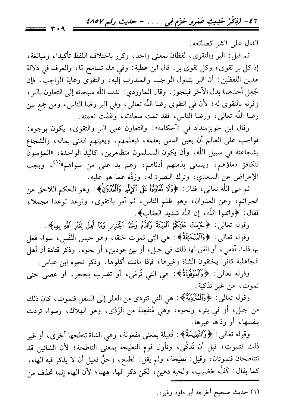 ثم نهى الله تعالى، فَقَالَ: {وَلَا تَعَاوَنُوا عَلَى الْإِثْمِ وَالْعُدْوَانِ}: وهو الحكم اللاحق عن الجرائم، وعن العدوان، وهو ظلم النَّاس، ثم أمر بالتقوى، وتوعد توعدا مجملا، فَقَالَ: {وَاتَّقُوا اللَّهَ إِنَّ اللَّهَ شَدِيدُ الْعِقَاب}.
