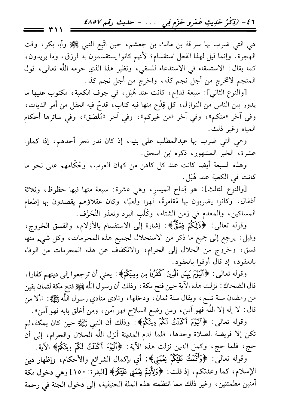 [والنوع الثاني]: سبعة قداح، كانت عند هُبَل، فِي جوف الكعبة، مكتوب عليها ما يدور بين النَّاس منْ النوازل، كل قِدْح منها فيه كتاب، قدحٌ فيه العقل منْ أمر الديات، وفي آخر "منكم"، وفي آخر "منْ غيركم"، وفي آخر "مُلصق"، وفي سائرها أحكام المياه وغير ذلك.