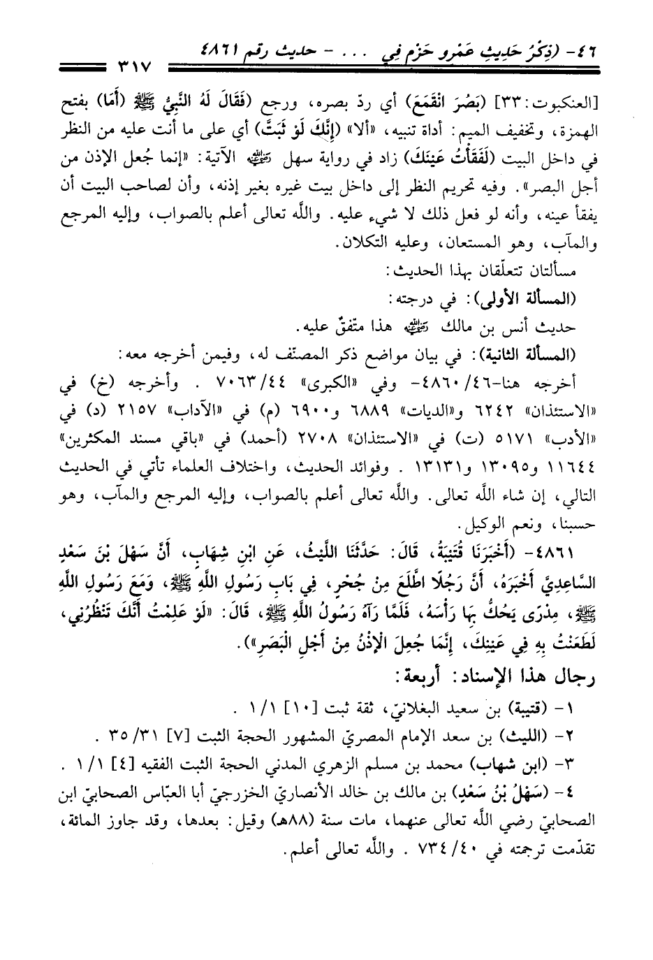 4861 - (أَخْبَرَنَا قُتَيْبَةُ، قَالَ: حَدَّثَنَا اللَّيْثُ، عَنِ ابْنِ شِهَابٍ، أَنَّ سَهْلَ بْنَ سَعْدٍ السَّاعِدِيَّ أَخْبَرَهُ، أَنَّ رَجُلاً اطَّلَعَ مِنْ جُحْرٍ، فِي بَابِ رَسُولِ اللَّهِ -صلى الله عليه وسلم-، وَمَعَ رَسُولِ اللَّهِ -صلى الله عليه وسلم-، مِدْرَى يَحُكُّ بِهَا رَأْسَهُ، فَلَمَّا رَآهُ رَسُولُ اللَّهِ -صلى الله عليه وسلم-، قَالَ: "لَوْ عَلِمْتُ أَنَّكَ تَنْظُرُنِي لَطَعَنْتُ بِهِ فِي عَيْنِكَ، إِنَّمَا جُعِلَ الإِذْنُ مِنْ أَجْلِ الْبَصَرِ").