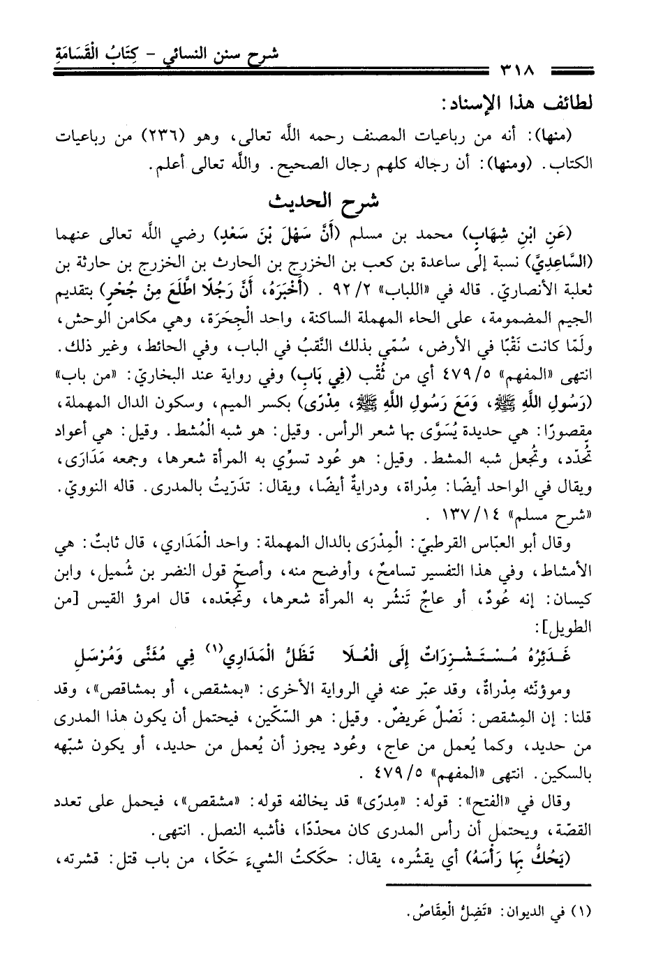 وَقَالَ فِي "الفتح": قوله: "مِدرًى" قد يخالفه قوله: "مشقص"، فيحمل عَلَى تعدد القصة، ويحتمل أن رأس المدرى كَانَ محدّدًا، فأشبه النصل. انتهى.