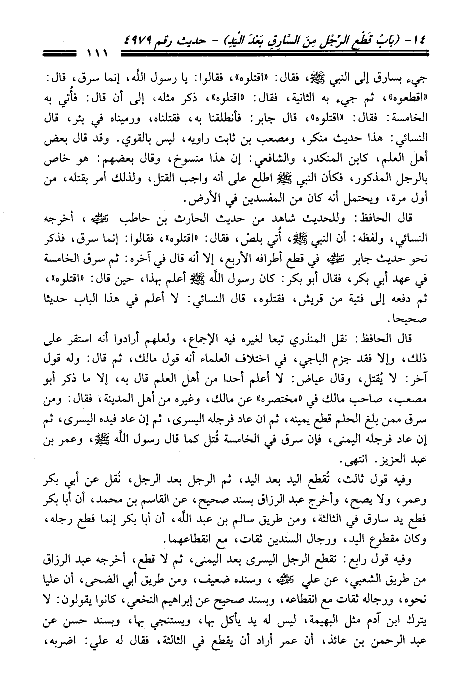 جيء بسارق إلى النبيّ -صلى الله عليه وسلم-، فَقَالَ: "اقتلوه"، فقالوا: يا رسول الله، إنما سرق، قَالَ: "اقطعوه"، ثم جيء به الثانية، فَقَالَ: "اقتلوه"، ذكر مثله، إلى أن قَالَ: فأُتي به الخامسة: فَقَالَ: "اقتلوه"، قَالَ جابر: فأنطلقنا به، فقتلناه، ورميناه فِي بئر، قَالَ النسائيّ: هَذَا حديث منكر، ومصعب بن ثابت راويه، ليس بالقوي. وَقَدْ قَالَ بعض أهل العلم، كابن المنكدر، والشافعي: إن هَذَا منسوخ، وَقَالَ بعضهم: هو خاص بالرجل المذكور، فكأن النبيّ -صلى الله عليه وسلم- اطلع عَلَى أنه واجب القتل، ولذلك أمر بقتله، منْ أول مرة، ويحتمل أنه كَانَ منْ المفسدين فِي الأرض.