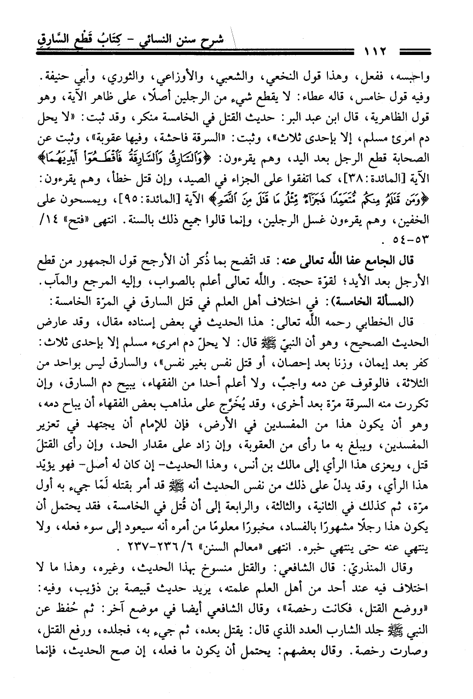 واحبسه، ففعل، وهذا قول النخعي، والشعبي، والأوزاعي، والثوري، وأبي حنيفة. وفيه قول خامس، قاله عطاء: لا يقطع شيء منْ الرجلين أصلاً، عَلَى ظاهر الآية، وهو قول الظاهرية، قَالَ ابن عبد البرّ: حديث القتل فِي الخامسة منكر، وَقَدْ ثبت: "لا يحل دم امرىء مسلم، إلا بإحدى ثلاث"، وثبت: "السرقة فاحشة، وفيها عقوبة"، وثبت عن الصحابة قطع الرجل بعد اليد، وهم يقرءون: {وَالسَّارِقُ وَالسَّارِقَةُ فَاقْطَعُوا أَيْدِيَهُمَا} الآية [المائدة: 38]، كما اتفقوا عَلَى الجزاء فِي الصيد، وإن قتل خطأ، وهم يقرءون: {وَمَنْ قَتَلَهُ مِنْكُمْ مُتَعَمِّدًا فَجَزَاءٌ مِثْلُ مَا قَتَلَ مِنَ النَّعَمِ} الآية [المائدة: 95]، ويمسحون عَلَى الخفين، وهم يقرءون غسل الرجلين، وإنما قالوا جميع ذلك بالسنة. انتهى "فتح" 14/ 53 - 54.