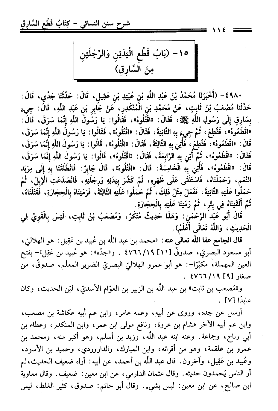 4980 - (أَخْبَرَنَا مُحَمَّدُ بْنُ عَبْدِ اللَّهِ بْنِ عُبَيْدِ بْنِ عَقِيلٍ، قَالَ: حَدَّثَنَا جَدِّي، قَالَ: حَدَّثَنَا مُصْعَبُ بْنُ ثَابِتٍ، عَنْ مُحَمَّدِ بْنِ الْمُنْكَدِرِ، عَنْ جَابِرِ بْنِ عَبْدِ اللَّهِ، قَالَ: جِيءَ بِسَارِقٍ إِلَى رَسُولِ اللَّهِ -صلى الله عليه وسلم-، فَقَالَ: "اقْتُلُوهُ"، فَقَالُوا: يَا رَسُولَ اللَّهِ إِنَّمَا سَرَقَ، قَالَ: "اقْطَعُوهُ"، فَقُطِعَ، ثُمَّ جِيءَ بِهِ الثَّانِيَةَ، فَقَالَ: "اقْتُلُوهُ"، فَقَالُوا: يَا رَسُولَ اللَّهِ إِنَّمَا سَرَقَ، قَالَ: "اقْطَعُوهُ"، فَقُطِعَ فَأُتِيَ بِهِ الثَّالِثَةَ، فَقَالَ: "اقْتُلُوهُ"، قَالُوا: يَا رَسُولَ اللَّهِ إِنَّمَا سَرَقَ، فَقَالَ: "اقْطَعُوهُ"، ثُمَّ أُتِيَ بِهِ الرَّابِعَةَ، فَقَالَ: "اقْتُلُوهُ"، قَالُوا: يَا رَسُولَ اللَّهِ إِنَّمَا سَرَقَ، قَالَ: "اقْطَعُوهُ". فَأُتِيَ بِهِ الْخَامِسَةَ قَالَ: "اقْتُلُوهُ"، قَالَ جَابِرٌ: فَانْطَلَقْنَا بِهِ إِلَى مِرْبَدِ النَّعَمِ، وَحَمَلْنَاهُ، فَاسْتَلْقَى عَلَى ظَهْرِهِ، ثُمَّ كَشَّرَ بِيَدَيْهِ وَرِجْلَيْهِ، فَانْصَدَعَتِ الإِبِلُ، ثُمَّ حَمَلُوا عَلَيْهِ الثَّانِيَةَ، فَفَعَلَ مِثْلَ ذَلِكَ، ثُمَّ حَمَلُوا عَلَيْهِ الثَّالِثَةَ، فَرَمَيْنَاهُ بِالْحِجَارَةِ، فَقَتَلْنَاهُ، ثُمَّ أَلْقَيْنَاهُ فِي بِئْرٍ، ثُمَّ رَمَيْنَا عَلَيْهِ بِالْحِجَارَةِ.