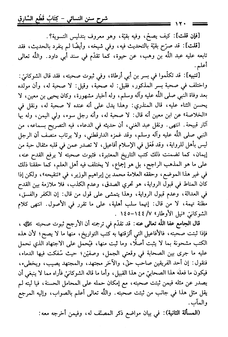 [تنبيه]: قد تكلّموا فِي بسر بن أبي أرطاة، وفي ثبوت صحبته، فقد قَالَ الشوكانيّ: واختلف فِي صحبة بسر المذكور، فقيل: له صحبة، وقيل: لا صحبة له، وأن مولده بعد وفاة النبيّ صلّى الله عليه وآله وسلم، وله أخبار مشهورة، وكان يحيى بن معين، لا يحسن الثناء عليه، قَالَ المنذري: وهذا يدلّ عَلَى أنه عنده لا صحبة له، ونقل فِي "الخلاصة" عن ابن معين أنه قَالَ: لا صحبة له، وأنه رجل سوء، ولي اليمن، وله بها آثار قبيحة. انتهى. ونقل عبد الغني، أن حديثه فِي الدعاء، فيه التصريح بسماعه، منْ النبيّ صلّى الله عليه وآله وسلم، وَقَدْ غمزه الدارقطنيّ، ولا يرتاب منصف أن الرجل ليس بأهل للرواية، وَقَدْ فَعَل فِي الإسلام أفاعيل، لا تصدر عمن فِي قلبه مثقال حبة منْ إبمان، كما تضمنت ذلك كتب التاريخ المعتبرة، فثبوت صحبته لا يرفع القدح عنه، عَلَى ما هو المذهب الراجح، بل هو إجماع، لا يختلف فيه أهل العلم، كما حققنا ذلك فِي غير هَذَا الموضع، وحققه العلامة محمد بن إبراهيم الوزير، فِي "تنقيحه"، ولكن إذا كَانَ المناط فِي قبول الرواية، هو تحري الصدق، وعدم الكذب، فلا ملازمة بين القدح فِي العدالة، وعدم قبول الرواية، وهذا يتمشى عَلَى قول منْ قَالَ: إن الكفر والفسق، مظنة تهمة، لا منْ قَالَ: إنهما سلب أهلية، عَلَى ما تقرر فِي الأصول. انتهى كلام الشوكانيّ "نيل الأوطار" 7/ 144 - 145.