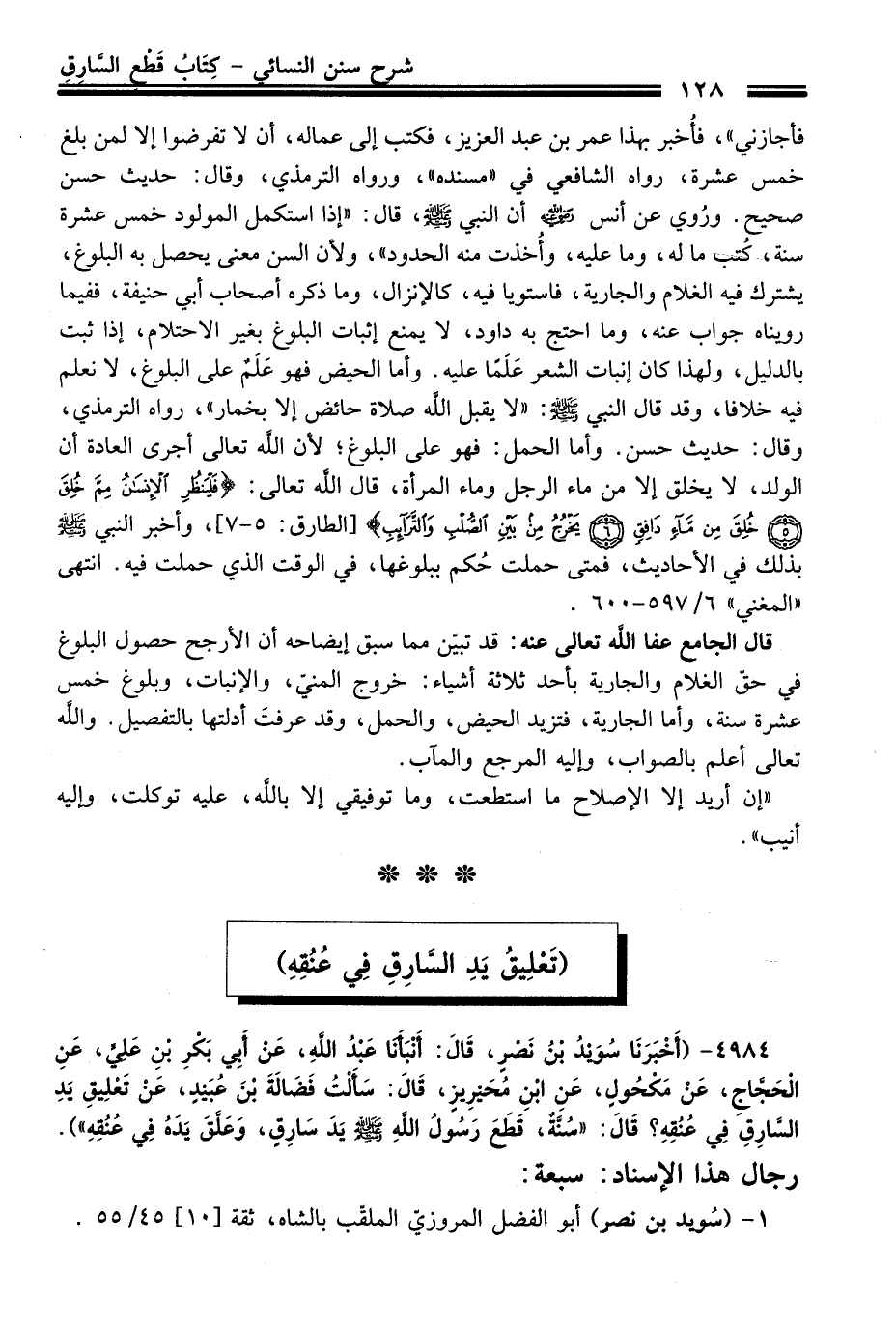 فأجازني"، فأُخبر بهذا عمر بن عبد العزيز، فكتب إلى عماله، أن لا تفرضوا إلا لمن بلغ خمس عشرة، رواه الشافعيّ فِي "مسنده"، ورواه الترمذيّ، وَقَالَ: حديث حسن صحيح. ورُوي عن أنس -رضي الله عنه- أن النبيّ -صلى الله عليه وسلم-، قَالَ: "إذا استكمل المولود خمس عشرة سنة، كُتب ما له، وما عليه، وأُخذت منه الحدود"، ولأن السن معنى يحصل به البلوغ، يشترك فيه الغلام والجارية، فاستويا فيه، كالإنزال، وما ذكره أصحاب أبي حنيفة، ففيما رويناه جواب عنه، وما احتج به داود، لا يمنع إثبات البلوغ بغير الاحتلام، إذا ثبت بالدليل، ولهذا كَانَ إنبات الشعر عَلَمًا عليه. وأما الحيض فهو عَلَمٌ عَلَى البلوغ، لا نعلم فيه خلافا، وَقَدْ قَالَ النبيّ -صلى الله عليه وسلم-: "لا يقبل الله صلاة حائض إلا بخمار"، رواه الترمذيّ، وَقَالَ: حديث حسن. وأما الحمل: فهو عَلَى البلوغ؛ لأن الله تعالى أجرى العادة أن الولد، لا يخلق إلا منْ ماء الرجل وماء المرأة، قَالَ الله تعالى: {فَلْيَنْظُرِ الْإِنْسَانُ مِمَّ خُلِقَ (5) خُلِقَ مِنْ مَاءٍ دَافِقٍ (6) يَخْرُجُ مِنْ بَيْنِ الصُّلْبِ وَالتَّرَائِبِ} [الطارق: 5 - 7]، وأخبر النبيّ -صلى الله عليه وسلم- بذلك فِي الأحاديث، فمتى حملت حُكم ببلوغها، فِي الوقت الذي حملت فيه. انتهى "المغني" 6/ 597 - 600.