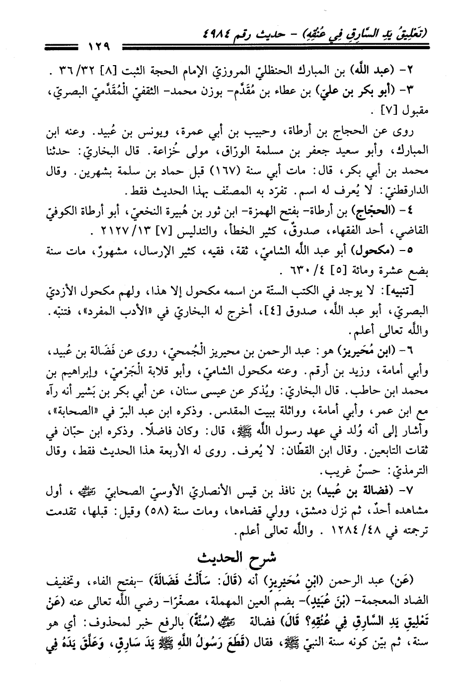 (عَن) عبد الرحمن (ابْنِ مُحَيْرِيزٍ) أنه (قَالَ: سَأَلْتُ فَضَالَةَ) -بفتح الفاء، وتخفيف الضاد المعجمة- (بْنَ عُبَيْدٍ) -بضم العين المهملة، مصغّرًا- رضي الله تعالى عنه (عَنْ تَعْلِيقِ يَدِ السَّارِقِ فِي عُنُقِهِ؟ قَالَ) فضالة -رضي الله عنه- (سُنَّةٌ) بالرفع خبر لمحذوف: أي هو سنة، ثم بيّن كونه سنة النبيّ -صلى الله عليه وسلم-، فَقَالَ (قَطَعَ رَسُولُ الله -صلى الله عليه وسلم- يَدَ سَارِقٍ، وَعَلَّقَ يَدَهُ فِي
