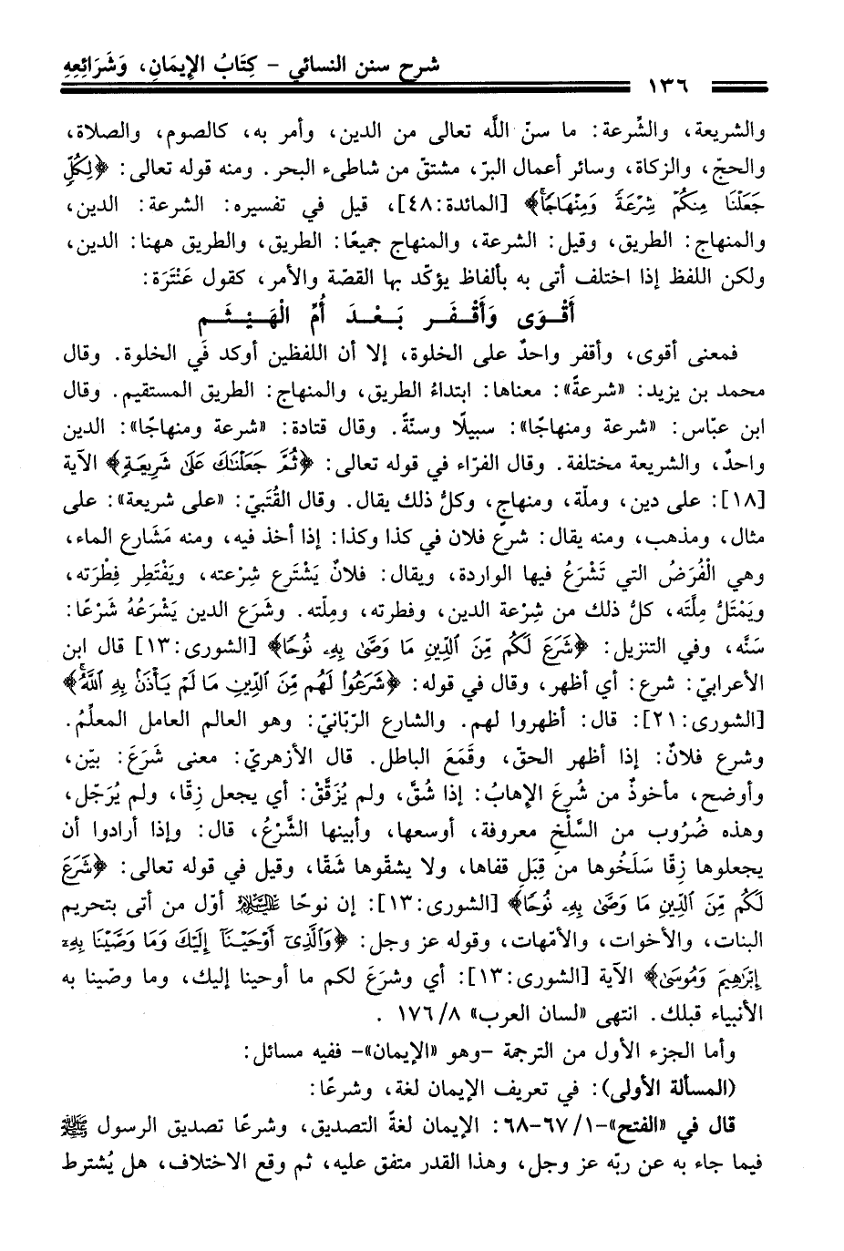 فمعنى أقوى، وأقفر واحدٌ عَلَى الخلوة، إلا أن اللفظين أوكد في الخلوة. وَقَالَ محمد بن يزيد: "شرعةً": معناها: ابتداءُ الطريق، والمنهاج: الطريق المستقيم. وَقَالَ ابن عبّاس: "شرعة ومنهاجًا": سبيلاً وسنّةً. وَقَالَ قتادة: "شرعة ومنهاجًا": الدين واحدٌ، والشريعة مختلفة. وَقَالَ الفرّاء فِي قوله تعالى: {ثُمَّ جَعَلْنَاكَ عَلَى شَرِيعَةٍ مِنَ الْأَمْرِ} الآية [18]: عَلَى دين، وملّة، ومنهاجٍ، وكلُّ ذلك يقال. وَقَالَ القُتَبيّ: "عَلَى شريعة": عَلَى مثال، ومذهب، ومنه يقال: شرع فلان فِي كذا وكذا: إذا أخذ فيه، ومنه مَشَارع الماء، وهي الْفُرَضُ التي تَشْرَعُ فيها الواردة، ويقال: فلانٌ يَشْتَرع شِرْعته، ويَفْتَطِر فِطْرَته، ويَمْتَلُّ مِلَّتَه، كلُّ ذلك منْ شِرْعة الدين، وفطرته، ومِلّته. وشَرَع الدين يَشْرَعُهُ شَرْعًا: سَنَّه، وفي التنزيل: {شَرَعَ لَكُمْ مِنَ الدِّينِ مَا وَصَّى بِهِ نُوحًا} [الشورى: 13]، قَالَ ابن الأعرابيّ: شرع: أي أظهر، وَقَالَ فِي قوله: {شَرَعُوا لَهُمْ مِنَ الدِّينِ مَا لَمْ يَأْذَنْ بِهِ اللَّهُ} [الشورى: 21]: قَالَ: أظهروا لهم. والشارع الرّبّانيّ: وهو العالم العامل المعلِّمُ. وشرع فلانٌ: إذا أظهر الحقّ، وقَمَعَ الباطل. قَالَ الأزهريّ: معنى شَرَعَ: بيّن، وأوضح، مأخوذٌ منْ شُرِعَ الإِهابُ: إذا شُقَّ، ولم يُزَقَّقْ: أي يجعل زِقّا، ولم يُرَجّل، وهذه ضُرُوب منْ السَّلْخِ معروفة، أوسعها، وأبينها الشَّرْعُ، قَالَ: وإذا أرادوا أن يجعلوها زِقًا سَلَخُوها منْ قِبَل قفاها، ولا يشقّوها شَقًا، وقيل فِي قوله تعالى: {شَرَعَ لَكُمْ مِنَ الدِّينِ مَا وَصَّى بِهِ نُوحًا} [الشورى: 13]: إن نوحًا -عليه السلام- أوّل منْ أتى بتحريم البنات، والأخوات، والأمّهات، وقوله عز وجل: {وَالَّذِي أَوْحَيْنَا إِلَيْكَ وَمَا وَصَّيْنَا بِهِ إِبْرَاهِيمَ وَمُوسَى} الآية [الشورى: 13]: أي وشرَعَ لكم ما أوحينا إليك، وما وصينا به الأنبياء قبلك. انتهى "لسان العرب" 8/ 176.