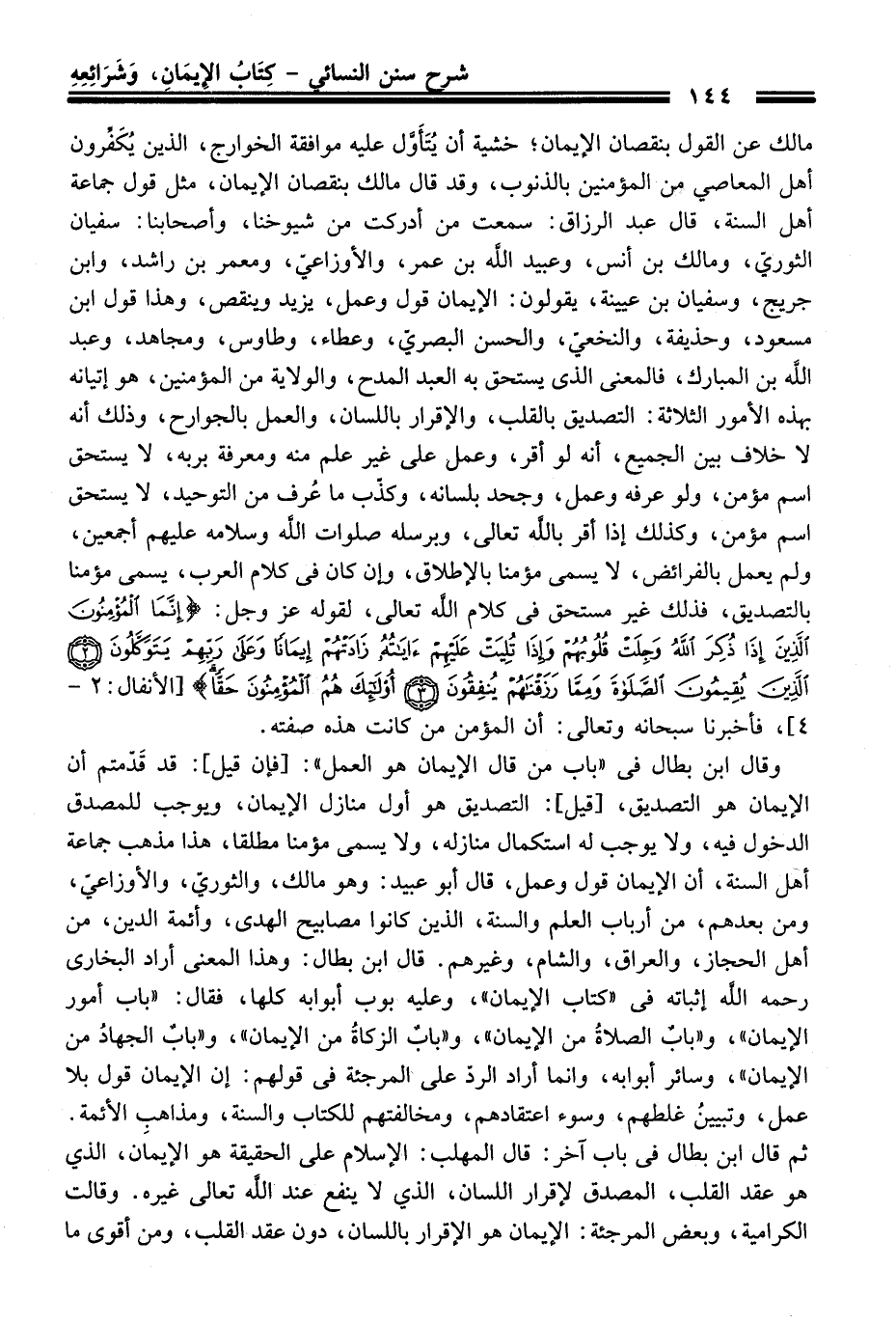 وَقَالَ ابن بطال فى "باب منْ قَالَ الإيمان هو العمل": [فإن قيل]: قد قَدّمتم أن الإيمان هو التصديق، [قيل]: التصديق هو أول منازل الإيمان، ويوجب للمصدق الدخول فيه، ولا يوجب له استكمال منازله، ولا يسمى مؤمنا مطلقا، هَذَا مذهب جماعة أهل السنة، أن الإيمان قول وعمل، قَالَ أبو عبيد: وهو مالك، والثوريّ، والأوزاعيّ، ومن بعدهم، منْ أرباب العلم والسنة، الذين كانوا مصابيح الهدى، وأئمة الدين، منْ أهل الحجاز، والعراق، والشام، وغيرهم. قَالَ ابن بطال: وهذا المعنى أراد البخارى رحمه الله إثباته فى "كتاب الإيمان"، وعليه بوب أبوابه كلها، فَقَالَ: "باب أمور الإيمان"، و"بابٌ الصلاةُ منْ الإيمان"، و"بابٌ الزكاةُ منْ الإيمان"، و"بابٌ الجهادُ منْ الإيمان"، وسائر أبوابه، وانما أراد الردّ عَلَى المرجئة فى قولهم: إن الإيمان قول بلا عمل، وتبيينُ غلطهم، وسوء اعتقادهم، ومخالفتهم للكتاب والسنة، ومذاهبِ الأئمة. ثم قَالَ ابن بطال فى باب آخر: قَالَ المهلب: الإسلام عَلَى الحقيقة هو الإيمان، الذي هو عقد القلب، المصدق لإقرار اللسان، الذي لا ينفع عند الله تعالى غيره. وقالت الكرامية، وبعض المرجئة: الإيمان هو الإقرار باللسان، دون عقد القلب، ومن أقوى ما