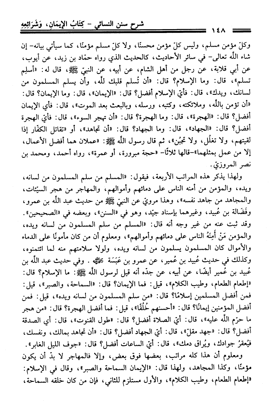 ولهذا يذكر هذه المراتب الأربعة، فيقول: "المسلم منْ سلم المسلمون منْ لسانه، ويده، والمؤمن منْ أمنه النَّاس عَلَى دمائهم وأموالهم، والمهاجر منْ هجر السيئات، والمجاهد منْ جاهد نفسه"، وهذا مروي عن النبيّ -صلى الله عليه وسلم- منْ حديث عبد الله بن عمرو، وفَضَالة بن عُبيد، وغيرهما بإسناد جيد، وهو فِي "السنن"، وبعضه فِي "الصحيحين". وَقَدْ ثبت عنه منْ غير وجه أنه قَالَ: "المسلم منْ سلم المسلمون منْ لسانه ويده، والمؤمن مَنْ أَمِنَهُ النَّاس عَلَى دمائهم وأموالهم"، ومعلوم أن منْ كَانَ مأمونا عَلَى الدماء والأموال كَانَ المسلمون يسلمون منْ لسانه ويده، ولولا سلامتهم منه لما ائتمنوه، وكذلك فِي حديث عُبيد بن عُمير، عن عمرو بن عَبَسَة -رضي الله عنه-. وفي حديث عبد الله بن عُبيد بن عُمير أيضًا، عن أبيه، عن جدّه أنه قيل لرسول الله -صلى الله عليه وسلم-: ما الإسلام؟ قَالَ: "إطعام الطعام، وطيب الكلام"، قيل: فما الإيمان؟ قَالَ: "السماحة، والصبر"، قيل: فمن أفضل المسلمين إسلامًا؟ قَالَ: "منْ سلم المسلمون منْ لسانه ويده"، قيل: فمن أفضل المؤمنين إيمانًا؟ قَالَ: "أحسنهم خُلُقًا"، قيل: فما أفضل الهجرة؟ قَالَ: "منْ هجر ما حرم الله عليه"، قَالَ: أيّ الصلاة أفضل؟ قَالَ: "طول القنوت"، قَالَ: أي الصدقة أفضل؟ قَالَ: "جهد مقلّ"، قَالَ: أي الجهاد أفضل؟ قَالَ: "أن تجاهد بمالك، ونفسك، فيُعقرُ جوادك، وُيراق دمك"، قَالَ: أي الساعات أفضل؟ قَالَ: "جوف الليل الغابر".