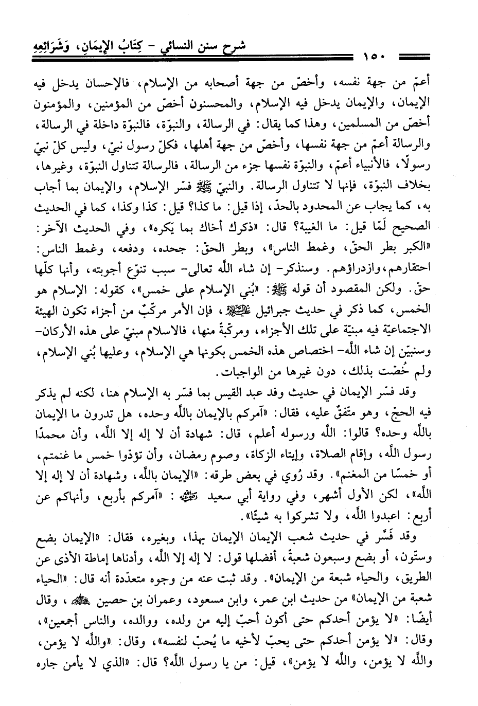 وَقَدْ فَسَّر فِي حديث شعب الإيمان الإيمان بهذا، وبغيره، فَقَالَ: "الإيمان بضع وستّون، أو بضع وسبعون شعبةً، أفضلها قول: لا إله إلا الله، وأدناها إماطة الأذى عن الطريق، والحياء شبعة منْ الإيمان". وَقَدْ ثبت عنه منْ وجوه متعدّدة أنه قَالَ: "الحياء شعبة منْ الإيمان" منْ حديث ابن عمر، وابن مسعود، وعمران بن حصين -رضي الله عنهم-، وَقَالَ أيضًا: "لا يؤمن أحدكم حَتَّى أكون أحبّ إليه منْ ولده، ووالده، والناس أجمعين"، وَقَالَ: "لا يؤمن أحدكم حَتَّى يحبّ لأخيه ما يُحبّ لنفسه"، وَقَالَ: "والله لا يؤمن، والله لا يؤمن، والله لا يؤمن"، قيل: منْ يا رسول الله؛ قَالَ: "الذي لا يأمن جاره