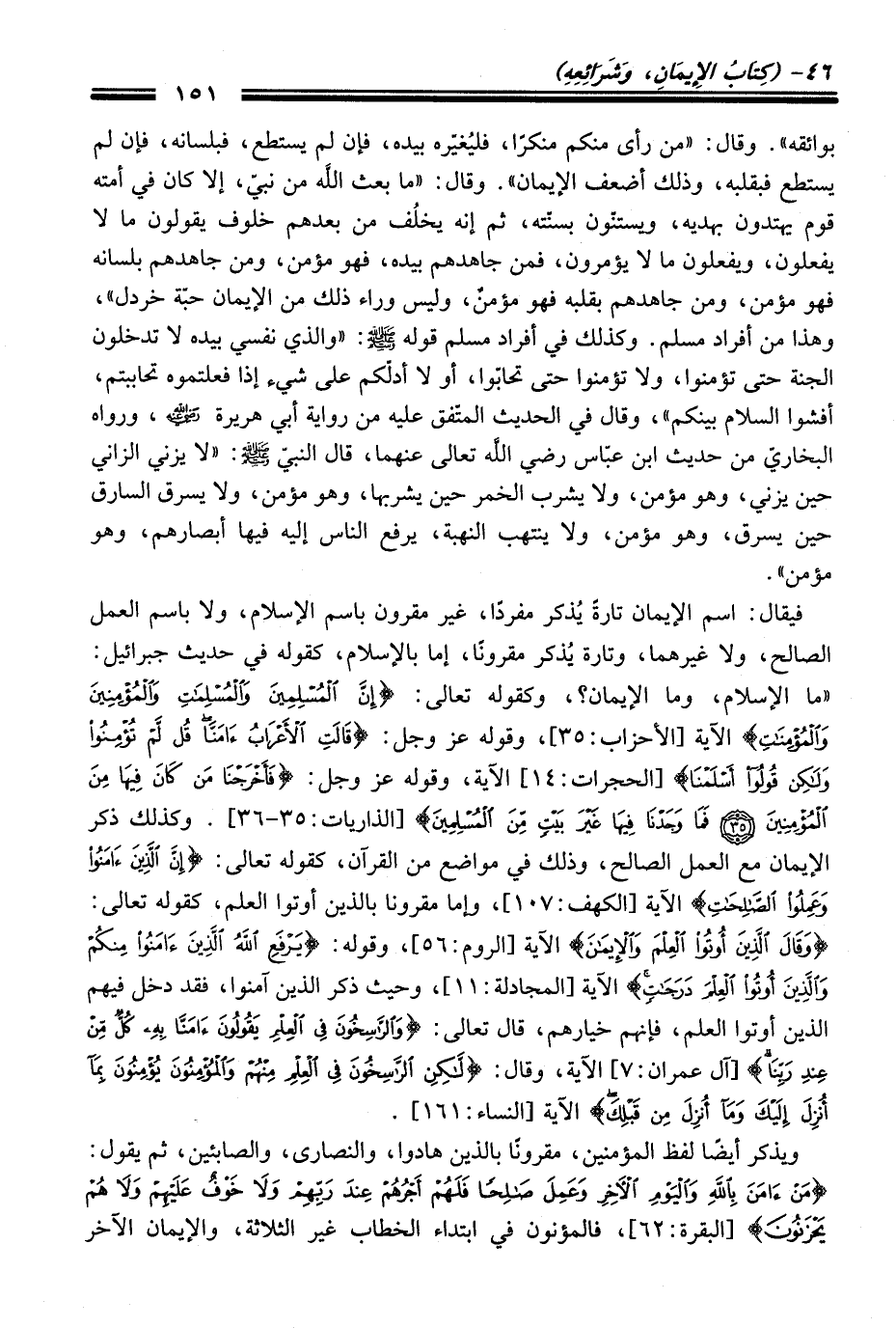 فيقال: اسم الإيمان تارةَ يُذكر مفردًا، غير مقرون باسم الإسلام، ولا باسم العمل الصالح، ولا غيرهما، وتارة يُذكر مقرونًا، إما بالإسلام، كقوله فِي حديث جبرائيل: "ما الإسلام، وما الإيمان؟، وكقوله تعالى: {إِنَّ الْمُسْلِمِينَ وَالْمُسْلِمَاتِ وَالْمُؤْمِنِينَ وَالْمُؤْمِنَاتِ} الآية [الأحزاب: 35]، وقوله عز وجل: {قَالَتِ الْأَعْرَابُ آمَنَّا قُلْ لَمْ تُؤْمِنُوا وَلَكِنْ قُولُوا أَسْلَمْنَا} [الحجرات: 14] الآية، وقوله عز وجل: {فَأَخْرَجْنَا مَنْ كَانَ فِيهَا مِنَ الْمُؤْمِنِينَ (35) فَمَا وَجَدْنَا فِيهَا غَيْرَ بَيْتٍ مِنَ الْمُسْلِمِينَ (36)} [الذاريات: 35 - 36]. وكذلك ذكر الإيمان مع العمل الصالح، وذلك فِي مواضع منْ القرآن، كقوله تعالى: {إِنَّ الَّذِينَ آمَنُوا وَعَمِلُوا الصَّالِحَاتِ} الآية [الكهف: 107]، وإما مقرونا بالذين أوتوا العلم، كقوله تعالى: {وَقَالَ الَّذِينَ أُوتُوا الْعِلْمَ وَالْإِيمَانَ} الآية [الروم: 56]، وقوله: {يَرْفَعِ اللَّهُ الَّذِينَ آمَنُوا مِنْكُمْ وَالَّذِينَ أُوتُوا الْعِلْمَ دَرَجَاتٍ} الآية [المجادلة: 11]، وحيث ذكر الذين آمنوا، فقد دخل فيهم الذين أوتوا العلم، فإنهم خيارهم، قَالَ تعالى: {وَالرَّاسِخُونَ فِي الْعِلْمِ يَقُولُونَ آمَنَّا بِهِ كُلٌّ مِنْ عِنْدِ رَبِّنَا} [آل عمران: 7] الآية، وَقَالَ: {لَكِنِ الرَّاسِخُونَ فِي الْعِلْمِ مِنْهُمْ وَالْمُؤْمِنُونَ يُؤْمِنُونَ بِمَا أُنْزِلَ إِلَيْكَ وَمَا أُنْزِلَ مِنْ قَبْلِكَ} الآية [النِّساء: 162].