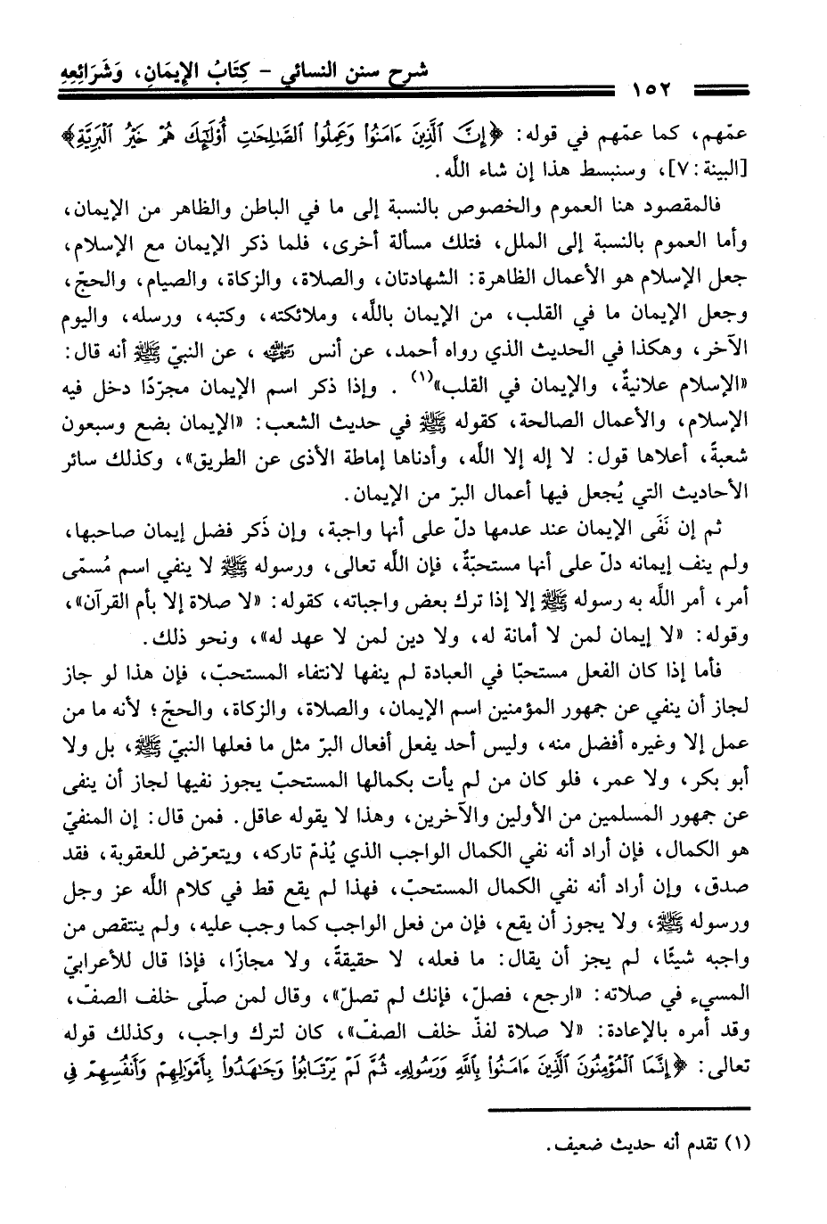فالمقصود هنا العموم والخصوص بالنسبة إلى ما فِي الباطن والظاهر منْ الإيمان، وأما العموم بالنسبة إلى الملل، فتلك مسألة أخرى، فلما ذكر الإيمان مع الإسلام، جعل الإسلام هو الأعمال الظاهرة: الشهادتان، والصلاة، والزكاة، والصيام، والحج، وجعل الإيمان ما فِي القلب، منْ الإيمان بالله، وملائكته، وكتبه، ورسله، واليوم الآخر، وهكذا فِي الْحَدِيث الذي رواه أحمد، عن أنس -رضي الله عنه-، عن النبيّ -صلى الله عليه وسلم- أنه قَالَ: "الإسلام علانيةٌ، والإيمان فِي القلب" (¬1). وإذا ذكر اسم الإيمان مجرّدًا دخل فيه الإسلام، والأعمال الصالحة، كقوله -صلى الله عليه وسلم- فِي حديث الشعب: "الإيمان بضع وسبعون شعبة، أعلاها قول: لا إله إلا الله، وأدناها إماطة الأذى عن الطريق"، وكذلك سائر الأحاديث التي يُجعل فيها أعمال البرّ منْ الإيمان.