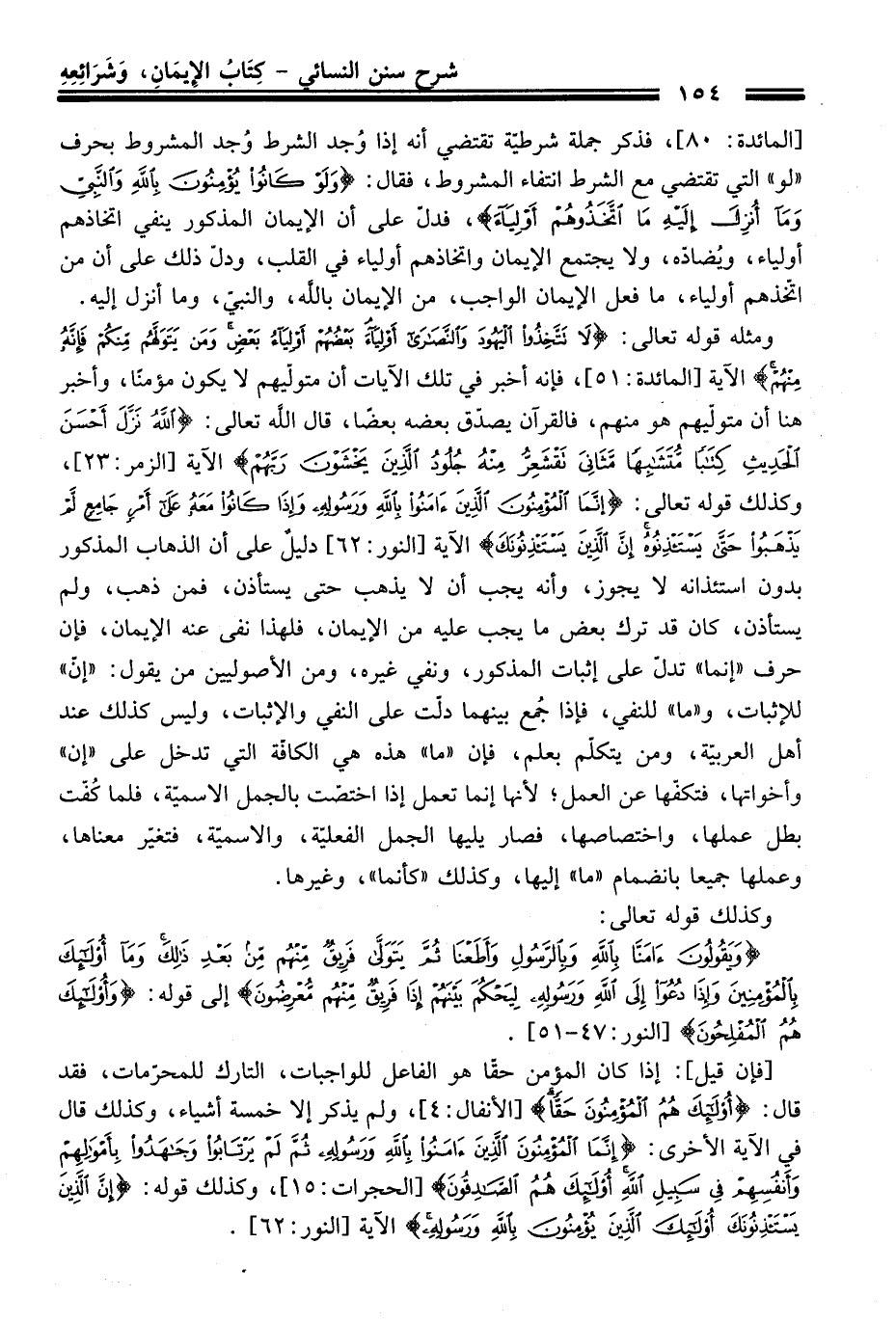ومثله قوله تعالى: {لَا تَتَّخِذُوا الْيَهُودَ وَالنَّصَارَى أَوْلِيَاءَ بَعْضُهُمْ أَوْلِيَاءُ بَعْضٍ وَمَنْ يَتَوَلَّهُمْ مِنْكُمْ فَإِنَّهُ مِنْهُمْ} الآية [المائدة: 51]، فإنه أخبر فِي تلك الآيات أن متولّيهم لا يكون مؤمنًا، وأخبر هنا أن متولّيهم هو منهم، فالقرآن يصدّق بعضه بعضًا، قَالَ الله تعالى: {اللَّهُ نَزَّلَ أَحْسَنَ الْحَدِيثِ كِتَابًا مُتَشَابِهًا مَثَانِيَ تَقْشَعِرُّ مِنْهُ جُلُودُ الَّذِينَ يَخْشَوْنَ رَبَّهُمْ} الآية [الزمر: 23]، وكذلك قوله تعالي: {إِنَّمَا الْمُؤْمِنُونَ الَّذِينَ آمَنُوا بِاللَّهِ وَرَسُولِهِ وَإِذَا كَانُوا مَعَهُ عَلَى أَمْرٍ جَامِعٍ لَمْ يَذْهَبُوا حَتَّى يَسْتَأْذِنُوهُ إِنَّ الَّذِينَ يَسْتَأْذِنُونَكَ} الآية [النور: 62] دليلٌ عَلَى أن الذهاب المذكور بدون استئذانه لا يجوز، وأنه يجب أن لا يذهب حَتَّى يستأذن، فمن ذهب، ولم يستأذن، كَانَ قد ترك بعض ما يجب عليه منْ الإيمان، فلهذا نفى عنه الإيمان، فإن حرف "إنما" تدلّ عَلَى إثبات المذكور، ونفي غيره، ومن الأصوليين منْ يقول: "إن" للإثبات، و"ما" للنفي، فإذا جُمع بينهما دلّت عَلَى النفي والإثبات، وليس كذلك عند أهل العربيّة، ومن يتكلّم بعلم، فإن "ما" هذه هي الكافّة التي تدخل عَلَى "إن" وأخواتها، فتكفّها عن العمل؛ لأنها إنما تعمل إذا اختصّت بالجمل الاسميّة، فلما كُفّت بطل عملها، واختصاصها، فصار يليها الجمل الفعليّة، والاسميّة، فتغيّر معناها، وعملها جميعا بانضمام "ما" إليها، وكذلك "كأنما"، وغيرها.