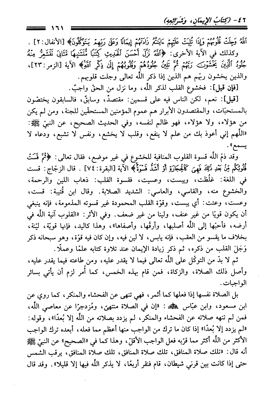 وَقَدْ ذمّ الله قسوة القلوب المنافية للخشوع فِي غير موضع، فَقَالَ تعالى: {ثُمَّ قَسَتْ قُلُوبُكُمْ مِنْ بَعْدِ ذَلِكَ فَهِيَ كَالْحِجَارَةِ أَوْ أَشَدُّ قَسْوَةً} الآية [البقرة: 74]. قَالَ الزجّاج: قست فِي اللغة: غلُظت، ويبست، وعسيت، فقسوة القلب: ذهاب اللين والرحمة، والخشوع منه، والقاسي، والعاسي: الشديد الصلابة. وَقَالَ ابن قُتيبة: قست، وعست، وعتت: أي يبست، وقوّة القلب المحمودة غير قسوته المذمومة، فإنه ينبغي أن يكون قويًّا منْ غير عنف، ولينا منْ غير ضعف. وفي الأثر: "القلوب آنية الله فِي أرضه، فأحبّها إلى الله أصلبها، وأرقّها، وأصفاها"، وهذا كاليد، فإنها قويّة، ليّنة، بخلاف ما يقسو منْ العقب، فإنه يابس، لا لين فيه، وإن كَانَ فيه قوّة، وهو سبحانه ذكر وَجَلَ القلب منْ ذكره، ثم ذكر زيادة الإيمان عند تلاوة كتابه علمًا وعملاً.