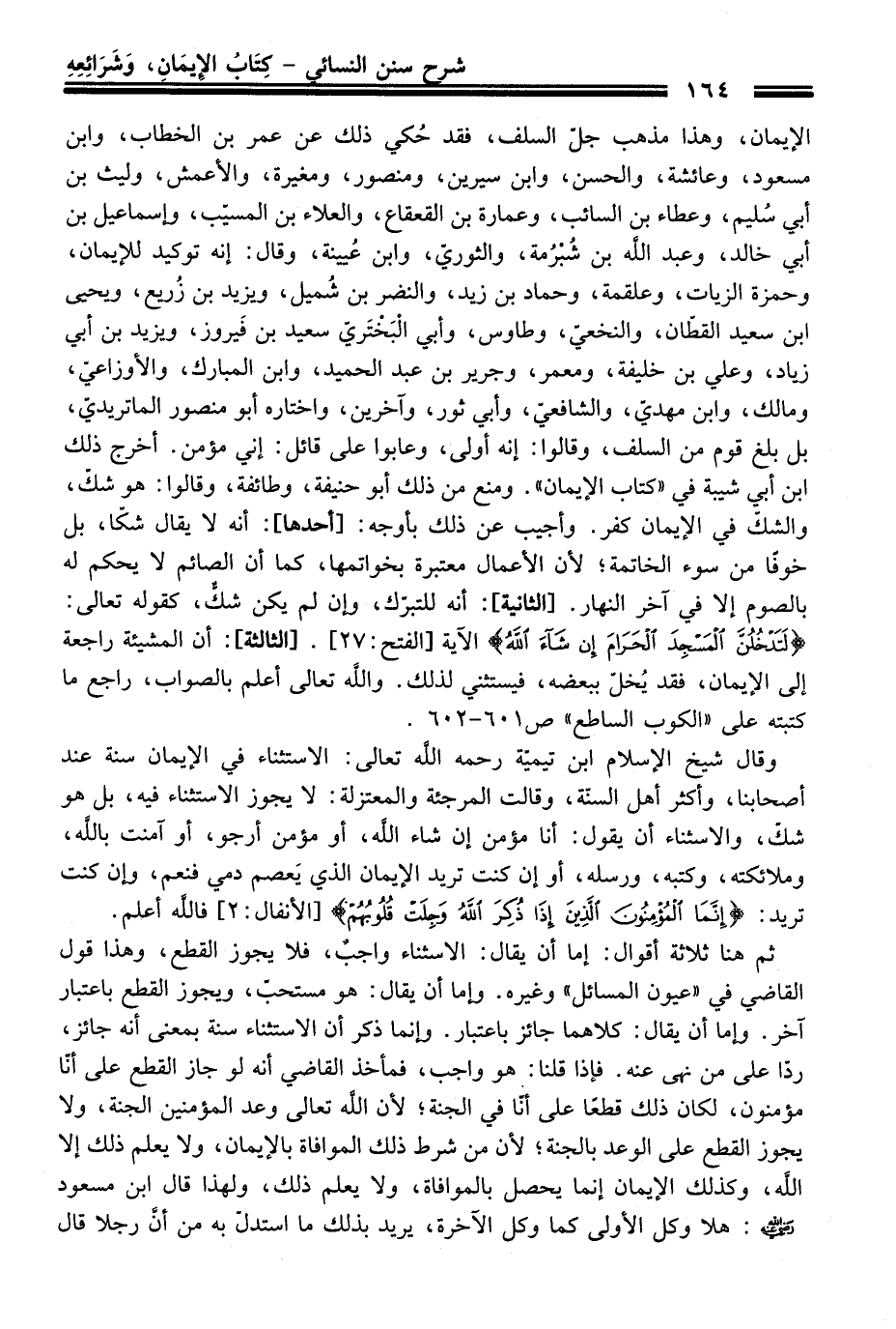 وَقَالَ شيخ الإسلام ابن تيمية رحمه الله تعالى: الاستثناء فِي الإيمان سنة عند أصحابنا، وأكثر أهل السنّة، وقالت المرجئة والمعتزلة: لا يجوز الاستثناء فيه، بل هو شكّ، والاسثناء أن يقول: أنا مؤمن إن شاء الله، أو مؤمن أرجو، أو آمنت بالله، وملائكته، وكتبه، ورسله، أو إن كنت تريد الإيمان الذي يَعصم دمي فنعم، وإن كنت تريد: {إِنَّمَا الْمُؤْمِنُونَ الَّذِينَ إِذَا ذُكِرَ اللَّهُ وَجِلَتْ قُلُوبُهُمْ} [الأنفال: 2] فالله أعلم.
