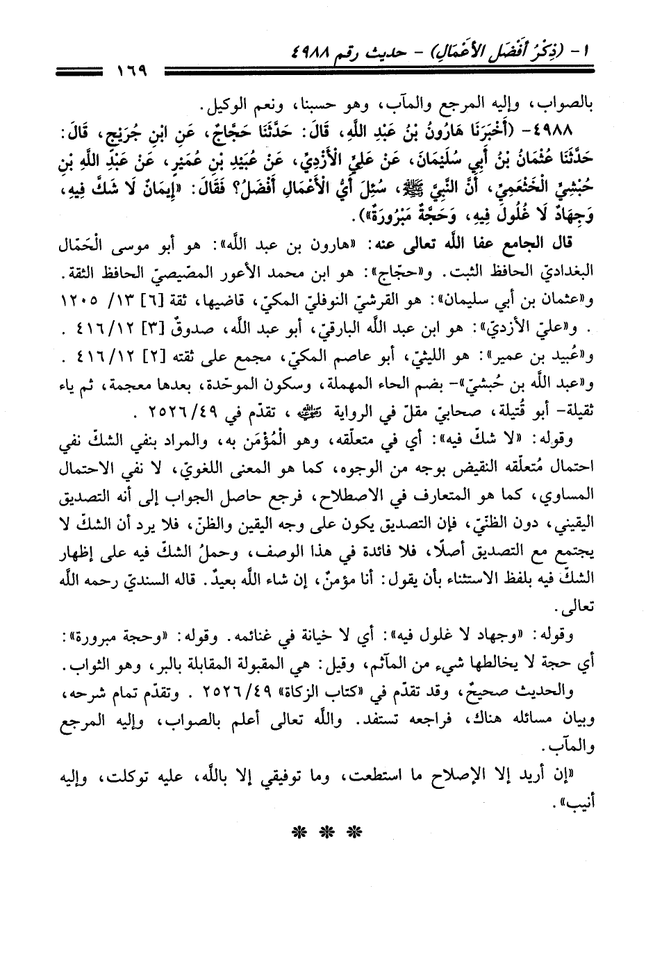 4988 - (أَخْبَرَنَا هَارُونُ بْنُ عَبْدِ اللَّهِ، قَالَ: حَدَّثَنَا حَجَّاجٌ، عَنِ ابْنِ جُرَيْجٍ، قَالَ: حَدَّثَنَا عُثْمَانُ بْنُ أَبِي سُلَيْمَانَ، عَنْ عَلِيٍّ الأَزْدِيِّ، عَنْ عُبَيْدِ بْنِ عُمَيْرٍ، عَنْ عَبْدِ اللَّهِ بْنِ حُبْشِيٍّ الْخَثْعَمِيِّ، أَنَّ النَّبِيَّ -صلى الله عليه وسلم-، سُئِلَ أَىُّ الأَعْمَالِ أَفْضَلُ؟ فَقَالَ: "إِيمَانٌ لاَ شَكَّ فِيهِ، وَجِهَادٌ لاَ غُلُولَ فِيهِ، وَحَجَّةٌ مَبْرُورَةٌ").