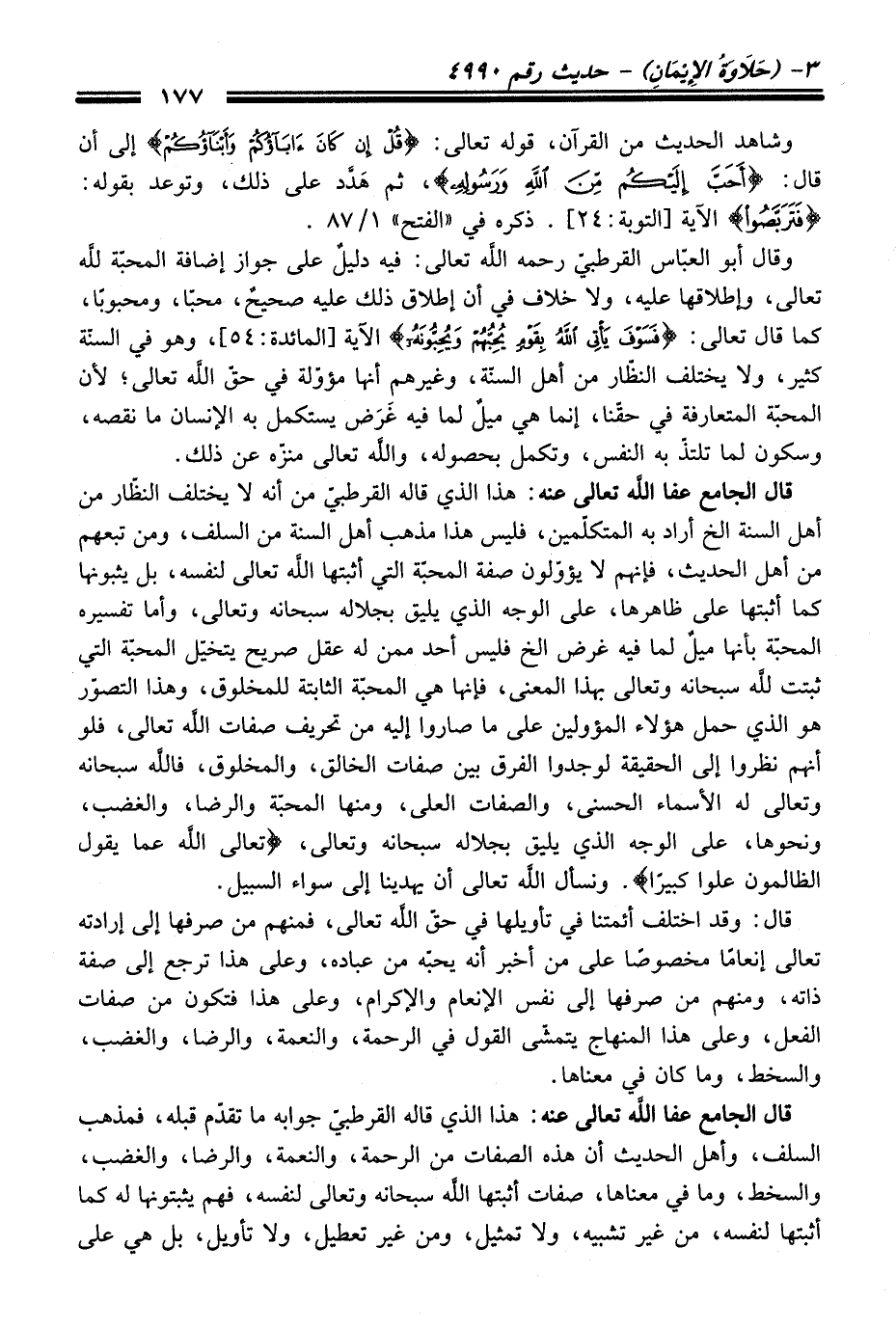 قَالَ الجامع عفا الله تعالى عنه: هَذَا الذي قاله القرطبيّ منْ أنه لا يختلف النظّار منْ أهل السنة الخ أراد به المتكلّمين، فليس هَذَا مذهب أهل السنة منْ السلف، ومن تبعهم منْ أهل الْحَدِيث، فإنهم لا يؤوّلون صفة المحبّة التي أثبتها الله تعالى لنفسه، بل يثبونها كما أثبتها عَلَى ظاهرها، عَلَى الوجه الذي يليق بجلاله سبحانه وتعالى، وأما تفسيره المحبّة بأنها ميلٌ لما فيه غرض الخ فليس أحد ممن له عقل صريح يتخيّل المحبّة التي ثبتت لله سبحانه وتعالى بهذا المعنى، فإنها هي المحبّة الثابتة للمخلوق، وهذا التصوّر هو الذي حمل هؤلاء المؤولين عَلَى ما صاروا إليه منْ تحريف صفات الله تعالى، فلو أنهم نظروا إلى الحقيقة لوجدوا الفرق بين صفات الخالق، والمخلوق، فالله سبحانه وتعالى له الأسماء الحسنى، والصفات العلى، ومنها المحبّة والرضا، والغضب، ونحوها، عَلَى الوجه الذي يليق بجلاله سبحانه وتعالى، {تعالى الله عما يقول الظالمون علوا كبيرًا}. ونسأل الله تعالى أن يهدينا إلى سواء السبيل.