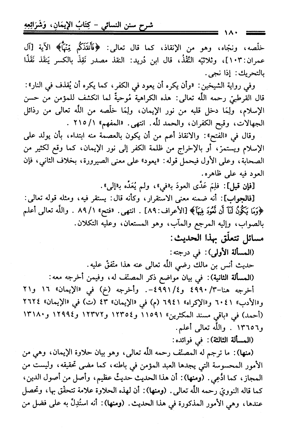 وفي رواية الشيخين: "وأن يكره أن يعود فِي الكفر، كما يكره أن يُقذف فِي النار": قَالَ القرطبيّ رحمه الله تعالى: هذه الكراهية مُوحيةٌ لما انكشف للمؤمن منْ حسن الإسلام، ولمَا دخل قلبه منْ نور الإيمان، ولِمَا خلّصه منْ الله تعالى منْ رذائل الجهالات، وقبح الكفران، والحمد لله. انتهى. "المفهم" 1/ 215.