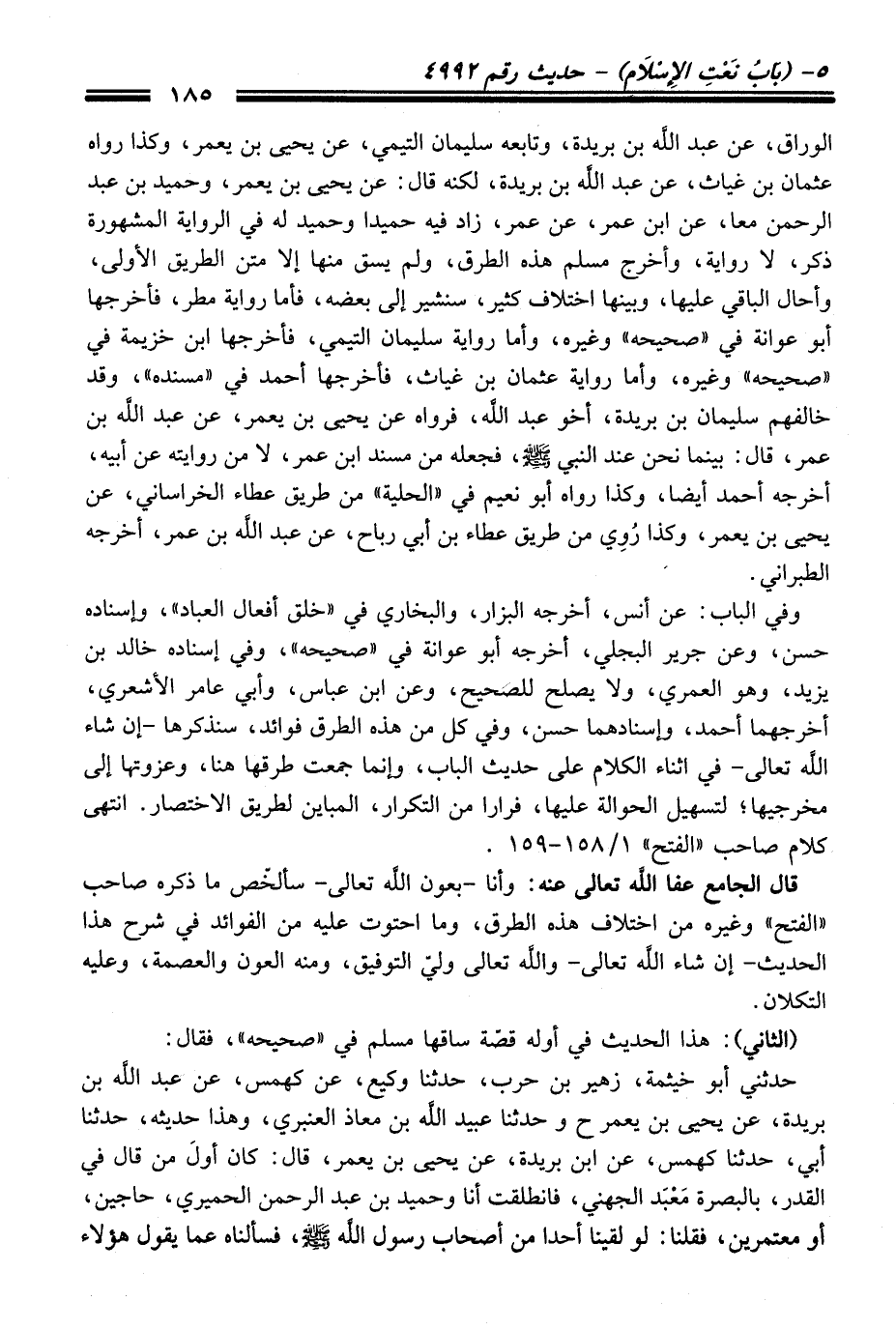 الوراق، عن عبد الله بن بريدة، وتابعه سليمان التيمي، عن يحيى بن يعمر، وكذا رواه عثمان بن غياث، عن عبد الله بن بريدة، لكنه قَالَ: عن يحيى بن يعمر، وحميد بن عبد الرحمن معا، عن ابن عمر، عن عمر، زاد فيه حميدا وحميد له فِي الرواية المشهورة ذكر، لا رواية، وأخرج مسلم هذه الطرق، ولم يسق منها إلا متن الطريق الأولى، وأحال الباقي عليها، وبينها اختلاف كثير، سنشير إلى بعضه، فأما رواية مطر، فأخرجها أبو عوانة فِي "صحيحه" وغيره، وأما رواية سليمان التيمي، فأخرجها ابن خزيمة فِي "صحيحه" وغيره، وأما رواية عثمان بن غياث، فأخرجها أحمد فِي "مسنده"، وَقَدْ خالفهم سليمان بن بريدة، أخو عبد الله، فرواه عن يحيى بن يعمر، عن عبد الله بن عمر، قَالَ: بينما نحن عند النبيّ -صلى الله عليه وسلم-، فجعله منْ مسند ابن عمر، لا منْ روايته عن أبيه، أخرجه أحمد أيضًا، وكذا رواه أبو نعيم فِي "الحلية" منْ طريق عطاء الخراساني، عن يحيى بن يعمر، وكذا رُوِي منْ طريق عطاء بن أبي رباح، عن عبد الله بن عمر، أخرجه الطبراني.