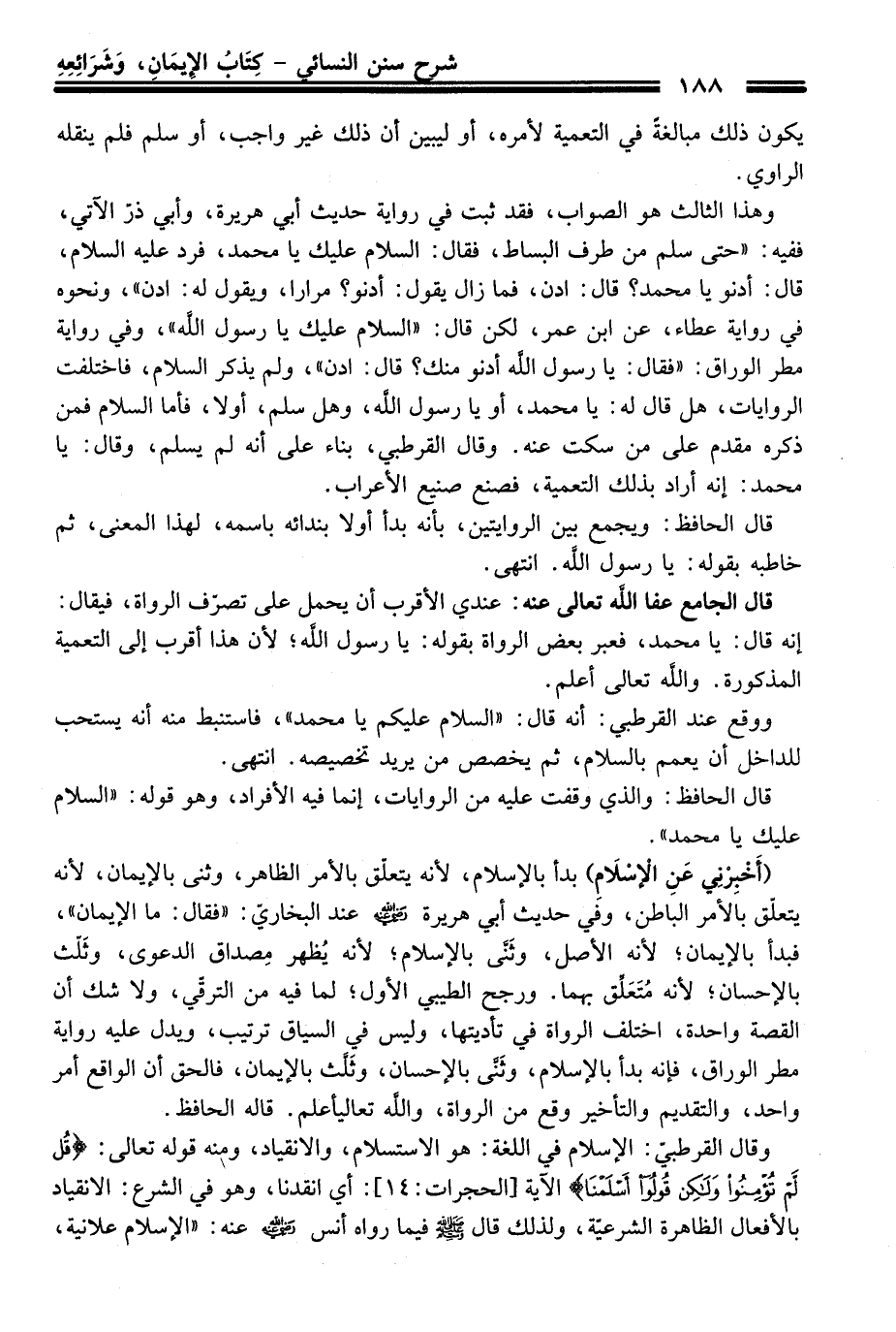 (أَخْبِرْنِي عَنِ الإِسْلاَمِ) بدأ بالإسلام، لأنه يتعلّق بالأمر الظاهر، وثنى بالإيمان، لأنه يتعلّق بالأمر الباطن، وفي حديث أبي هريرة -رضي الله عنه- عند البخاريّ: "فَقَالَ: ما الإيمان"، فبدأ بالإيمان؛ لأنه الأصل، وثَنَّى بالإسلام؛ لأنه يُظهر مِصداق الدعوى، وثَلّث بالإحسان؛ لأنه مُتَعَلِّق بهما. ورجح الطيبي الأول؛ لما فيه منْ الترقّي، ولا شك أن القصة واحدة، اختلف الرواة فِي تأديتها، وليس فِي السياق ترتيب، ويدل عليه رواية مطر الوراق، فإنه بدأ بالإسلام، وثَنَّى بالإحسان، وثَلَّث بالإيمان، فالحق أن الواقع أمر واحد، والتقديم والتأخير وقع منْ الرواة، والله تعالى أعلم. قاله الحافظ.