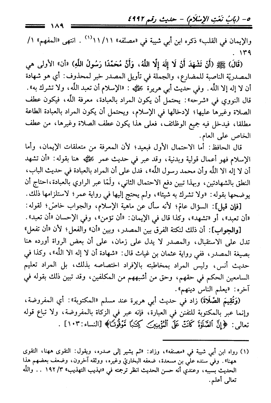 قَالَ الحافظ: أما الاحتمال الأول فبعيد؛ لأن المعرفة منْ متعلقات الإيمان، وأما الإسلام فهو أعمال قولية وبدنية، وَقَدْ عبر فِي حديث عمر -رضي الله عنه- هنا بقوله: "أن تشهد أن لا إله الا الله وأن محمد رسول الله"، فدل عَلَى أن المراد بالعبادة فِي حديث الباب، النطق بالشهادتين، وبهذا تبين دفع الاحتمال الثاني، ولَمّا عبر الراوي بالعبادة، احتاج أن يوضحها بقوله: "ولا تشرك به شيئا"، ولم يحتج إليها فِي رواية عمر؛ لاستلزامها ذلك.