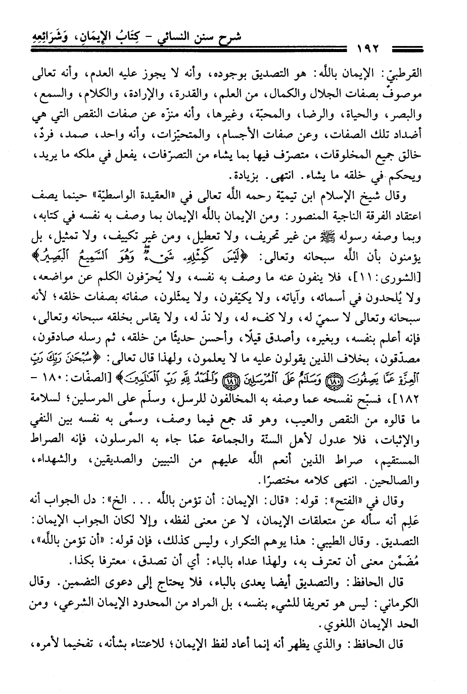 القرطبيّ: الإيمان بالله: هو التصديق بوجوده، وأنه لا يجوز عليه العدم، وأنه تعالى موصوفٌ بصفات الجلال والكمال، منْ العلم، والقدرة، والإرادة، والكلام، والسمع، والبصر، والحياة، والرضا، والمحبة، وغيرها، وأنه منزّه عن صفات النقص التي هي أضداد تلك الصفات، وعن صفات الأجسام، والمتحيزات، وأنه واحد، صمد، فردٌ، خالق جميع المخلوقات، متصرّف فيها بما يشاء منْ التصرّفات، يفعل فِي ملكه ما يريد، ويحكم فِي خلقه ما يشاء. انتهى. بزيادة.