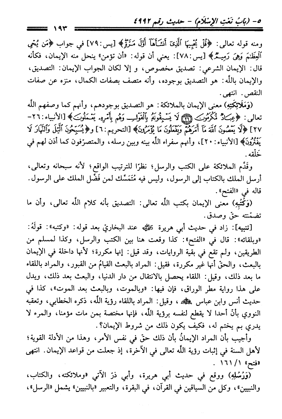 [تنبيه]: زاد فِي حديث أبي هريرة -رضي الله عنه- عند البخاريّ بعد قوله: "وكتبه": قولَهُ: "وبلقائه": قَالَ فِي "الفتح": كذا وقعت هنا بين الكتب والرسل، وكذا لمسلم منْ الطريقين، ولم تقع فِي بقية الروايات، وَقَدْ قيل: إنها مكررة؛ لأنها داخلة فِي الإيمان بالبعث، والحقّ أنها غير مكررة، فقيل: المراد بالبعث القيامُ منْ القبور، والمراد باللقاء ما بعد ذلك، وقيل: اللقاء يحصل بالانتقال منْ دار الدنيا، والبعث بعد ذلك، ويدل عَلَى هَذَا رواية مطر الوراق، فإن فيها: "وبالموت، وبالبعث بعد الموت"، كذا فِي حديث أنس وابن عباس -رضي الله عنهم-، وقيل: المراد باللقاء رؤية الله، ذكره الخطّابيّ، وتعقبه النوويّ بأنّ أحدا لا يقطع لنفسه برؤية الله، فإنها مختصة بمن مات مؤمنا، والمرء لا يدري بم يختم له، فكيف يكون ذلك منْ شروط الإيمان؟.