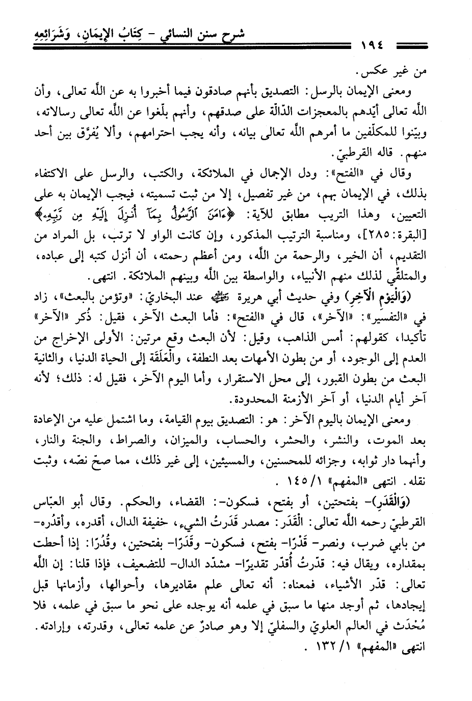 وَقَالَ فِي "الفتح": ودل الإجمال فِي الملائكة، والكتب، والرسل عَلَى الاكتفاء بذلك، فِي الإيمان بهم، منْ غير تفصيل، إلا منْ ثبت تسميته، فيجب الإيمان به عَلَى التعيين، وهذا التريب مطابق للآية: {آمَنَ الرَّسُولُ بِمَا أُنْزِلَ إِلَيْهِ مِنْ رَبِّهِ} [البقرة: 285]، ومناسبة الترتيب المذكور، وإن كانت الواو لا ترتب، بل المراد منْ التقديم، أن الخير، والرحمة منْ الله، ومن أعظم رحمته، أن أنزل كتبه إلى عباده، والمتلقِّي لذلك منهم الأنبياء، والواسطة بين الله وبينهم الملائكة. انتهى.