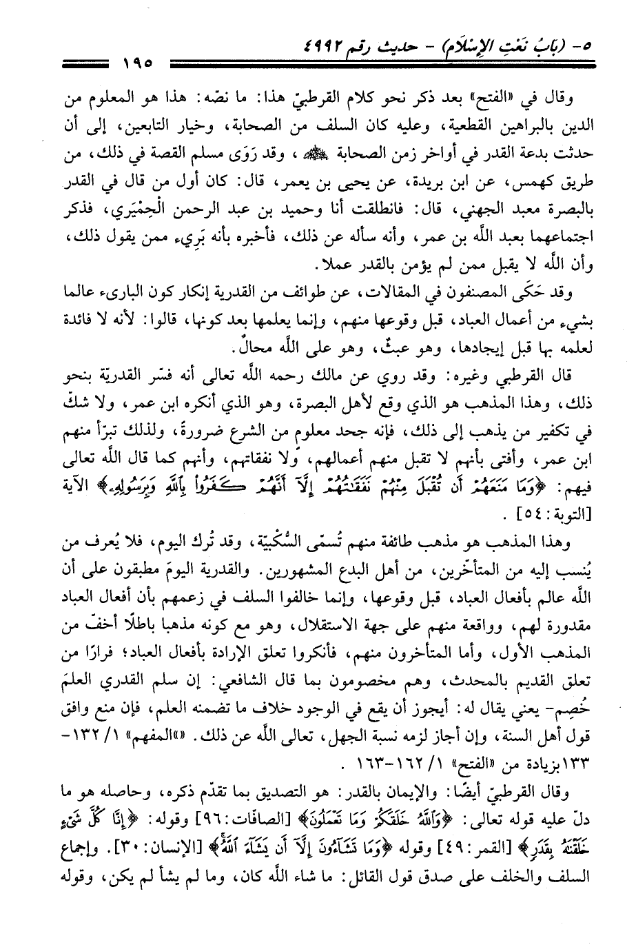 وَقَالَ فِي "الفتح" بعد ذكر نحو كلام القرطبيّ هَذَا: ما نصّه: هَذَا هو المعلوم منْ الدين بالبراهين القطعية، وعليه كَانَ السلف منْ الصحابة، وخيار التابعين، إلى أن حدثت بدعة القدر فِي أواخر زمن الصحابة -رضي الله عنهم-، وَقَدْ رَوَى مسلم القصة فِي ذلك، منْ طريق كهمس، عن ابن بريدة، عن يحيى بن يعمر، قَالَ: كَانَ أول منْ قَالَ فِي القدر بالبصرة معبد الجهني، قَالَ: فانطلقت أنا وحميد بن عبد الرحمن الْحِمْيَري، فذكر اجتماعهما بعبد الله بن عمر، وأنه سأله عن ذلك، فأخبره بأنه بَرِيء ممن يقول ذلك، وأن الله لا يقبل ممن لم يؤمن بالقدر عملا.