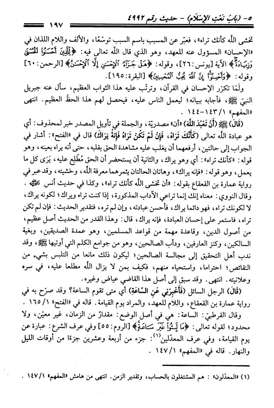 تخشى الله كأنك تراه"، فعبّر عن المسبب باسم السبب توسّعًا، والألف واللام اللذان فِي "الإحسان" المسؤول عنه للعهد، وهو الذي قَالَ الله تعالى فيه: {لِلَّذِينَ أَحْسَنُوا الْحُسْنَى وَزِيَادَةٌ} الآية [يونس: 26]، وقوله: {هَلْ جَزَاءُ الْإِحْسَانِ إِلَّا الْإِحْسَانُ} [الرحمن: 60] وقوله: {وَأَحْسِنُوا إِنَّ اللَّهَ يُحِبُّ الْمُحْسِنِينَ} [البقرة: 195].