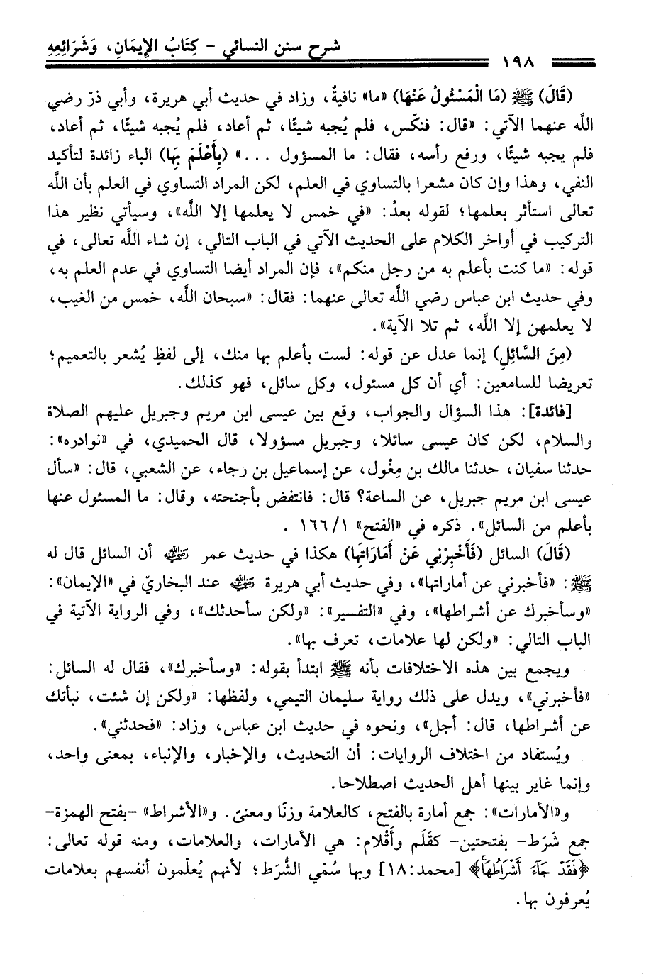 (قَالَ) -صلى الله عليه وسلم- (مَا الْمَسْئُولُ عَنْهَا) "ما" نافيةٌ، وزاد فِي حديث أبي هريرة، وأبي ذرّ رضي الله عنهما الآتي: "قَالَ: فنكّس، فلم يُجبه شيئًا، ثم أعاد، فلم يُجبه شيئًا، ثم أعاد، فلم يجبه شيئًا، ورفع رأسه، فَقَالَ: ما المسؤول ... " (بِأَعْلَمَ بِهَا) الباء زائدة لتأكيد النفي، وهذا وإن كَانَ مشعرا بالتساوي فِي العلم، لكن المراد التساوي فِي العلم بأن الله تعالى استأثر بعلمها؛ لقوله بعدُ: "فِي خمس لا يعلمها إلا الله"، وسيأتي نظير هَذَا التركيب فِي أواخر الكلام عَلَى الْحَدِيث الآتي فِي الباب التالي، إن شاء الله تعالى، فِي قوله: "ما كنت بأعلم به منْ رجل منكم"، فإن المراد أيضًا التساوي فِي عدم العلم به، وفي حديث ابن عباس رضي الله تعالى عنهما: فَقَالَ: "سبحان الله، خمس منْ الغيب، لا يعلمهن إلا الله، ثم تلا الآية".
