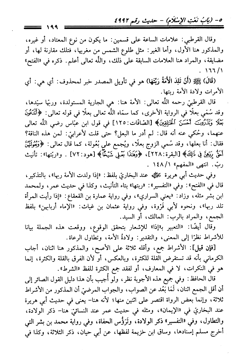 قَالَ الحافظ: وفي جميع هذه الأجوبة نظر، ولو أُجيب بأن هَذَا دليل القول الصائر إلى أن أقل الجمع اثنان، لَمَا بَعُد عن الصواب، والجواب المرضيّ أن المذكور منْ الأشراط ثلاثة، وإنما بعض الرواة اقتصر عَلَى اثنين منها؛ لأنه هنا -يعنى فِي حديث أبي هريرة عند البخاريّ فِي "الإيمان"، ومثله فِي حديث عمر عند النسائيّ هنا- ذكر الولادة، والتطاول، وفي "التفسير" ذكر الولادة، وتَرَؤُّس الحفاة، وفي رواية محمد بن بشر التي أخرج مسلم إسنادها، وساق ابن خزيمة لفظها، عن أبي حيان، ذكر الثلاثة، وكذا فِي
