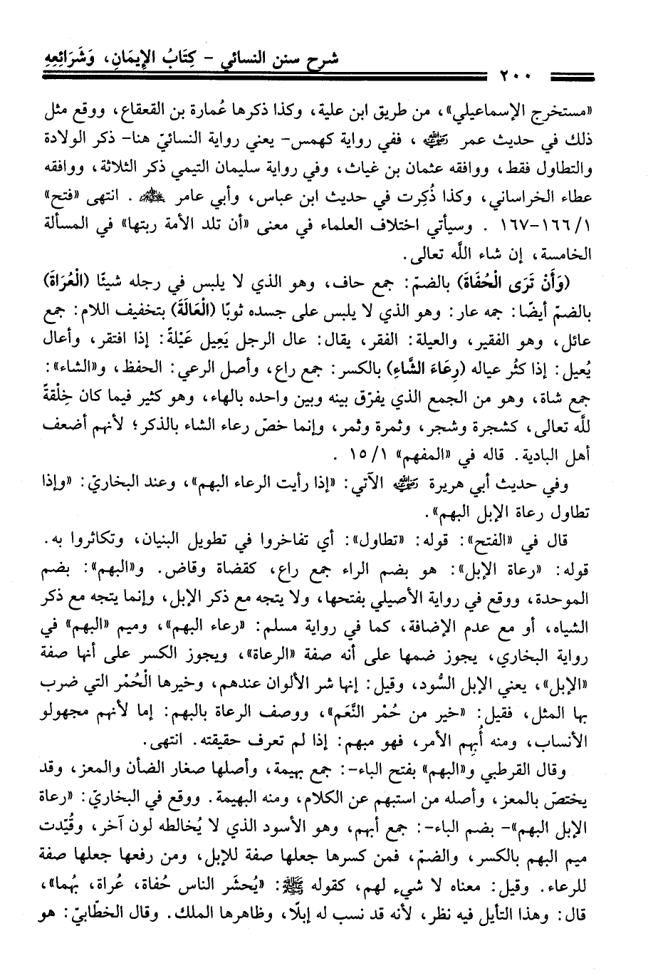 (وَأَنْ تَرَى الْحُفَاةَ) بالضم: جمع حاف، وهو الذي لا يلبس فِي رجله شيئا (الْعُرَاةَ) بالضمّ أيضًا: جمعه عار: وهو الذي لا يلبس عَلَى جسده ثوبًا (الْعَالَةَ) بتخفيف اللام: جمع عائل، وهو الفقير، والعيلة: الفقر، يقال: عال الرجل يَعِيل عَيْلةً: إذا افتقر، وأعال يُعيل: إذا كثُر عياله (رِعَاءَ الشَّاءِ) بالكسر: جمع راع، وأصل الرعي: الحفظ، و"الشاء": جمع شاة، وهو منْ الجمع الذي يفرّق بينه وبين واحده بالهاء، وهو كثير فيما كَانَ خِلْقةً لله تعالى، كشجرة وشجر، وثمرة وثمر، وإنما خصّ رعاء الشاء بالذكر؛ لأنهم أضعف أهل البادية. قاله فِي "المفهم" 1/ 15.