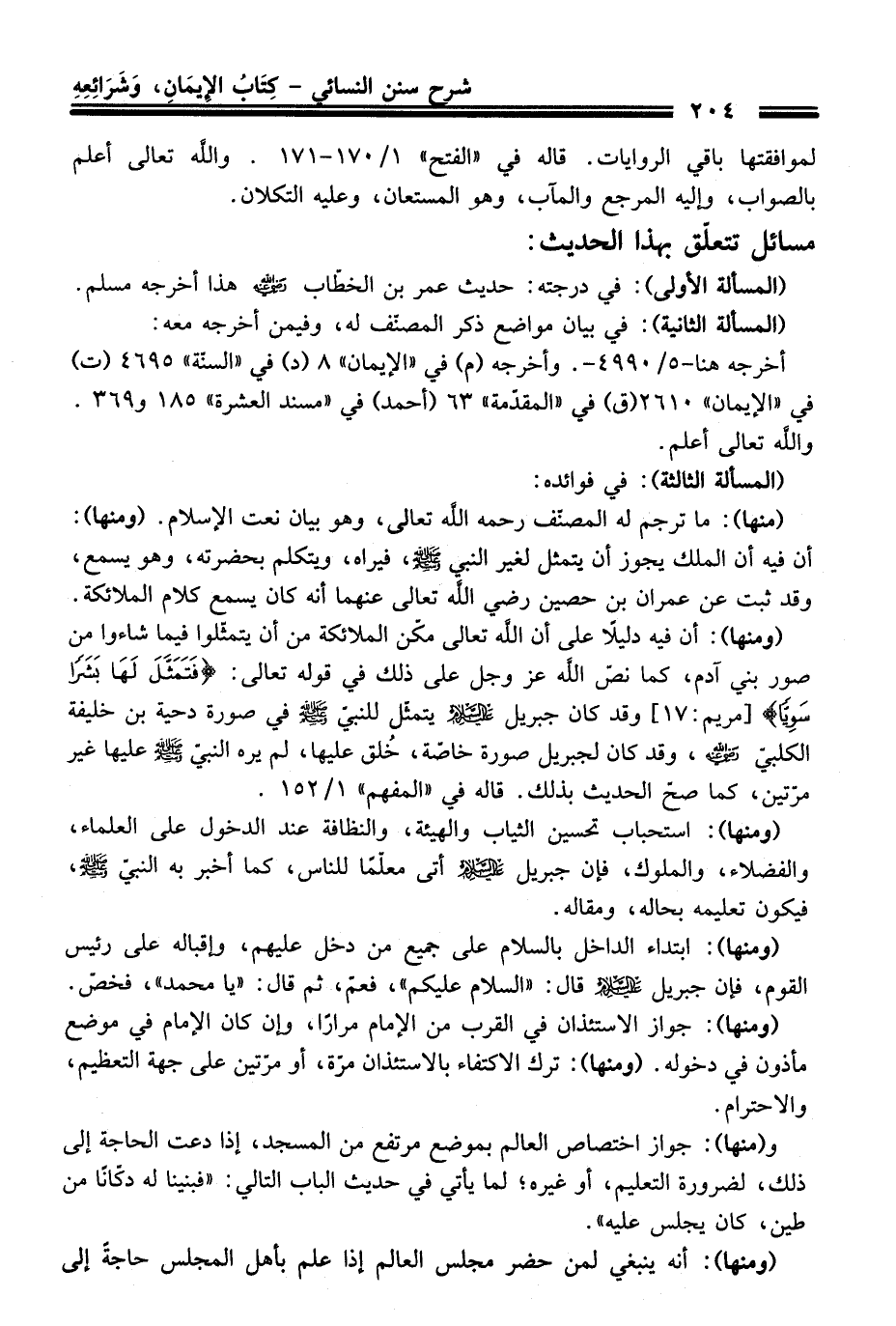 (منها): ما ترجم له المصنّف رحمه الله تعالى، وهو بيان نعت الإسلام. (ومنها): أن فيه أن الملك يجوز أن يتمثل لغير النبيّ -صلى الله عليه وسلم-، فيراه، ويتكلم بحضرته، وهو يسمع، وَقَدْ ثبت عن عمران بن حصين رضي الله تعالى عنهما أنه كَانَ يسمع كلام الملائكة.