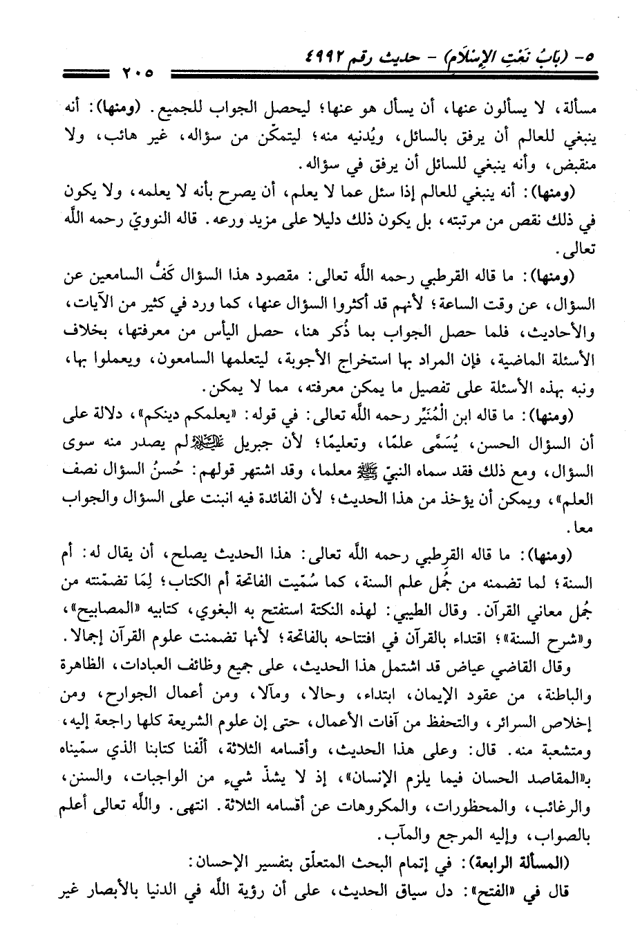 وَقَالَ القاضي عياض قد اشتمل هَذَا الْحَدِيث، عَلَى جميع وظائف العبادات، الظاهرة والباطنة، منْ عقود الإيمان، ابتداء، وحالا، ومآلا، ومن أعمال الجوارح، ومن إخلاص السرائر، والتحفظ منْ آفات الأعمال، حَتَّى إن علوم الشريعة كلها راجعة إليه، ومتشعبة منه. قَالَ: وعلى هَذَا الْحَدِيث، وأقسامه الثلاثة، ألّفنا كتابنا الذي سمّيناه بـ"المقاصد الحسان فيما يلزم الإنسان"، إذ لا يشذّ شيء منْ الواجبات، والسنن، والرغائب، والمحظورات، والمكروهات عن أقسامه الثلاثة. انتهى. والله تعالى أعلم بالصواب، وإليه المرجع والمآب.