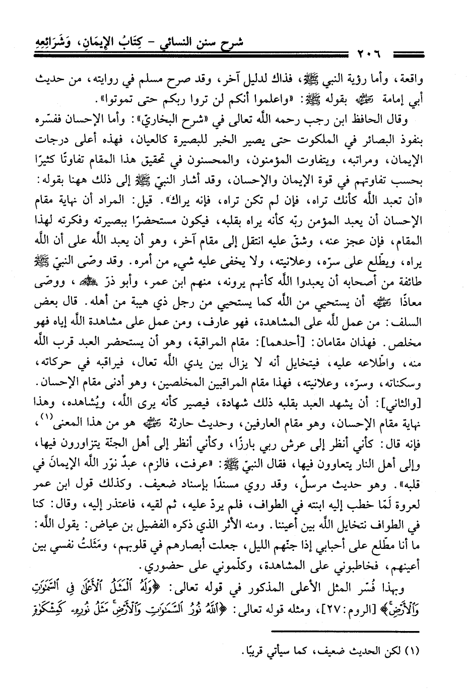 وَقَالَ الحافظ ابن رَجَب رحمه الله تعالى فِي "شرح البخاريّ": وأما الإحسان ففسّره بنفوذ البصائر فِي الملكوت حَتَّى يصير الخبر للبصيرة كالعيان، فهذه أعلى درجات الإيمان، ومراتبه، ويتفاوت المؤمنون، والمحسنون فِي تحقيق هَذَا المقام تفاوتًا كثيرًا بحسب تفاوتهم فِي قوة الإيمان والإحسان، وَقَدْ أشار النبيّ -صلى الله عليه وسلم- إلى ذلك هاهنا بقوله: "أن تعبد الله كأنك تراه، فإن لم تكن تراه، فإنه يراك". قيل: المراد أن نهاية مقام الإحسان أن يعبد المؤمن ربه كأنه يراه بقلبه، فيكون مستحضرًا ببصيرته وفكرته لهذا المقام، فإن عجز عنه، وشقّ عليه انتقل إلى مقام آخر، وهو أن يعبد الله عَلَى أن الله يراه، ويطّلع عَلَى سره، وعلانيته، ولا يخفى عليه شيء منْ أمره. وَقَدْ وصّى النبيّ -صلى الله عليه وسلم- طائفة منْ أصحابه أن يعبدوا الله كأنهم يرونه، منهم ابن عمر، وأبو ذرّ -رضي الله عنهم-، ووصّى معاذًا -رضي الله عنه- أن يستحيي منْ الله كما يستحيي منْ رجل ذي هيبة منْ أهله. قَالَ بعض السلف: منْ عمل لله عَلَى المشاهدة، فهو عارف، ومن عمل عَلَى مشاهدة الله إياه فهو مخلص. فهذان مقامان: [أحدهما]: مقام المراقبة، وهو أن يستحضر العبد قرب الله منه، واطّلاعه عليه، فيتخايل أنه لا يزال بين يدي الله تعال، فيراقبه فِي حركاته، وسكناته، وسرّه، وعلانيته، فهذا مقام المراقبين المخلصين، وهو أدنى مقام الإحسان. [والثاني]: أن يشهد العبد بقلبه ذلك شهادة، فيصير كأنه يرى الله، ويُشاهده، وهذا نهاية مقام الإحسان، وهو مقام العارفين، وحديث حارثة -رضي الله عنه- هو منْ هَذَا المعنى (¬1)، فإنه قَالَ: كأني أنظر إلى عرش ربي بارزًا، وكأني أنظر إلى أهل الجنّة يتزاورون فيها، وإلى أهل النار يتعاوون فيها، فَقَالَ النبيّ -صلى الله عليه وسلم- "عرفت، فالزم، عبدٌ نوّر الله الإيمانَ فِي قلبه". وهو حديث مرسلٌ، وَقَدْ روي مسندًا بإسناد ضعيف. وكذلك قول ابن عمر لعروة لَمّا خطب إليه ابنته فِي الطواف، فلم يردّ عليه، ثم لقيه، فاعتذر إليه، وَقَالَ: كنا فِي الطواف نتخايل الله بين أعيننا. ومنه الأثر الذي ذكره الفضيل بن عياض: يقول الله: ما أنا مطّلع عَلَى أحبابي إذا جنّهم الليل، جعلت أبصارهم فِي قلوبهم، ومَثَلتُ نفسي بين أعينهم، فخاطبوني عَلَى المشاهدة، وكلّموني عَلَى حضوري.