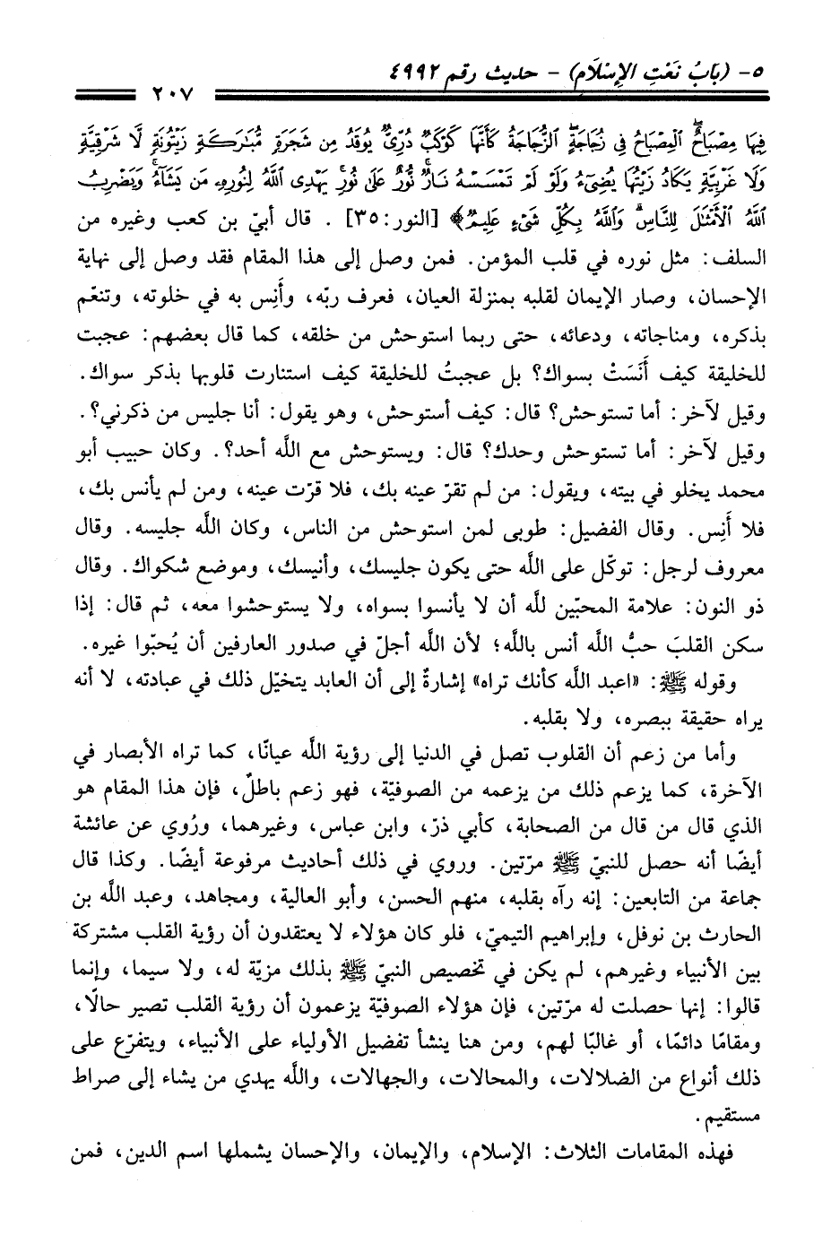 فِيهَا مِصْبَاحٌ الْمِصْبَاحُ فِي زُجَاجَةٍ الزُّجَاجَةُ كَأَنَّهَا كَوْكَبٌ دُرِّيٌّ يُوقَدُ مِنْ شَجَرَةٍ مُبَارَكَةٍ زَيْتُونَةٍ لَا شَرْقِيَّةٍ وَلَا غَرْبِيَّةٍ يَكَادُ زَيْتُهَا يُضِيءُ وَلَوْ لَمْ تَمْسَسْهُ نَارٌ نُورٌ عَلَى نُورٍ يَهْدِي اللَّهُ لِنُورِهِ مَنْ يَشَاءُ وَيَضْرِبُ اللَّهُ الْأَمْثَالَ لِلنَّاسِ وَاللَّهُ بِكُلِّ شَيْءٍ عَلِيمٌ (35)} [النور: 35]. قَالَ أبيّ بن كعب وغيره منْ السلف: مثل نوره فِي قلب المؤمن. فمن وصل إلى هَذَا المقام فقد وصل إلى نهاية الإحسان، وصار الإيمان لقلبه بمنزلة العيان، فعرف ربه، وأَنِس به فِي خلوته، وتنعم بذكره، ومناجاته، ودعائه، حَتَّى ربما استوحش منْ خلقه، كما قَالَ بعضهم: عجبت للخليقة كيف أَنَسَتْ بسواك؟ بل عجبتُ للخليقة كيف استنارت قلوبها بذكر سواك. وقيل لآخر: أما تستوحش؟ قَالَ: كيف أستوحش، وهو يقول: أنا جليس منْ ذكرني؟. وقيل لآخر: أما تستوحش وحدك؟ قَالَ: ويستوحش مع الله أحد؟. وكان حبيب أبو محمد يخلو فِي بيته، ويقول: منْ لم تقرّ عينه بك، فلا قرّت عينه، ومن لم يأنس بك، فلا أَنِس. وَقَالَ الفضيل: طوبى لمن استوحش منْ النَّاس، وكان الله جليسه. وَقَالَ معروف لرجل: توكّل عَلَى الله حَتَّى يكون جليسك، وأنيسك، وموضع شكواك. وَقَالَ ذو النون: علامة المحبّين لله أن لا يأنسوا بسواه، ولا يستوحشوا معه، ثم قَالَ: إذا سكن القلبَ حبُّ الله أنس بالله؛ لأن الله أجلّ فِي صدور العارفين أن يُحبّوا غيره.