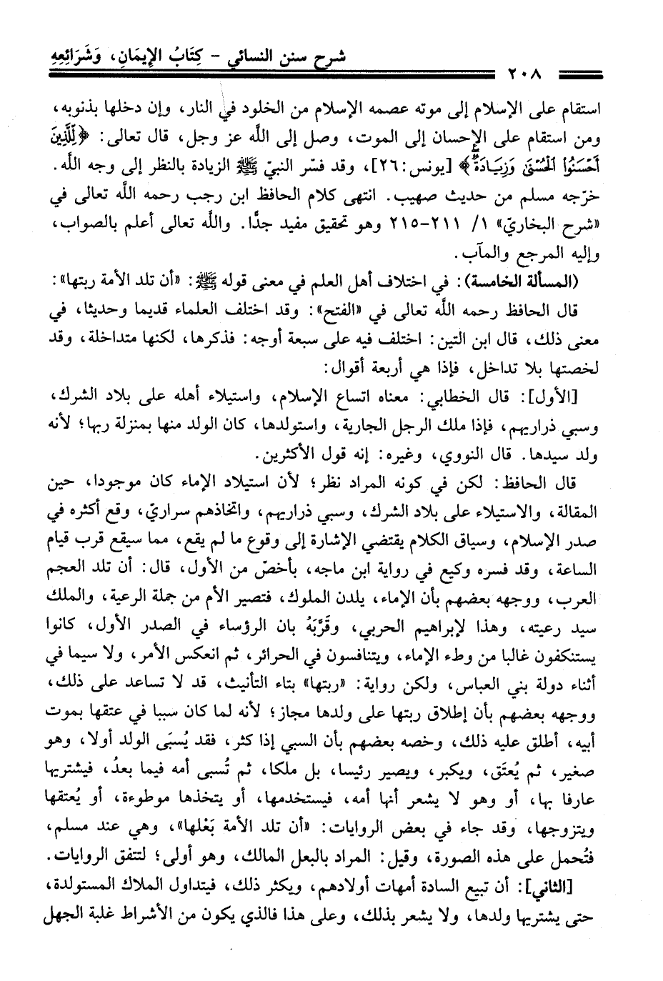 قَالَ الحافظ: لكن فِي كونه المراد نظر؛ لأن استيلاد الإماء كَانَ موجودا، حين المقالة، والاستيلاء عَلَى بلاد الشرك، وسبي ذراريهم، واتخاذهم سراريّ، وقع أكثره فِي صدر الإسلام، وسياق الكلام يقتضي الإشارة إلى وقوع ما لم يقع، مما سيقع قرب قيام الساعة، وَقَدْ فسره وكيع فِي رواية ابن ماجه، بأخص منْ الأول، قَالَ: أن تلد العجم العرب، ووجهه بعضهم بأن الإماء، يلدن الملوك، فتصير الأم منْ جملة الرعية، والملك سيد رعيته، وهذا لإبراهيم الحربي، وقَرَّبَهُ بان الرؤساء فِي الصدر الأول، كانوا يستنكفون غالبا منْ وطء الإماء، ويتنافسون فِي الحرائر، ثم انعكس الأمر، ولاسيما فِي أثناء دولة بني العبّاس، ولكن رواية: "ربتها" بتاء التأنيث، قد لا تساعد عَلَى ذلك، ووجهه بعضهم بأن إطلاق ربتها عَلَى ولدها مجاز؛ لأنه لما كَانَ سببا فِي عتقها بموت أبيه، أطلق عليه ذلك، وخصه بعضهم بأن السبي إذا كثر، فقد يُسبَى الولد أولا، وهو صغير، ثم يُعتَق، ويكبر، ويصير رئيسا، بل ملكا، ثم تُسبى أمه فيما بعدُ، فيشريها عارفا بها، أو وهو لا يشعر أنها أمه، فيستخدمها، أو يتخذها موطوءة، أو يُعتقها ويتزوجها، وَقَدْ جاء فِي بعض الروايات: "أن تلد الأمة بَعْلها"، وهي عند مسلم، فتُحمل عَلَى هذه الصورة، وقيل: المراد بالبعل المالك، وهو أولى؛ لتتفق الروايات.