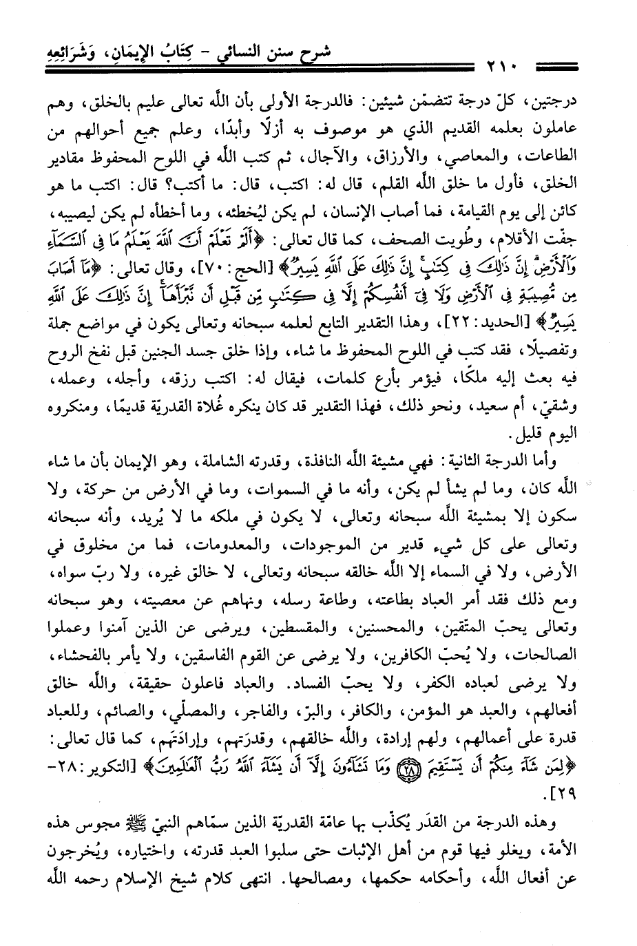 وأما الدرجة الثانية: فهي مشيئة الله النافذة، وقدرته الشاملة، وهو الإيمان بأن ما شاء الله كَانَ، وما لم يشأ لم يكن، وأنه ما فِي السموات، وما فِي الأرض منْ حركة، ولا سكون إلا بمشيئة الله سبحانه وتعالى، لا يكون فِي ملكه ما لا يُريد، وأنه سبحانه وتعالى عَلَى كل شيء قدير منْ الموجودات، والمعدومات، فما منْ مخلوق فِي الأرض، ولا فِي السماء إلا الله خالقه سبحانه وتعالى، لا خالق غيره، ولا رب سواه، ومع ذلك فقد أمر العباد بطاعته، وطاعة رسله، ونهاهم عن معصيته، وهو سبحانه وتعالى يحبّ المتّقين، والمحسنين، والمقسطين، ويرضى عن الذين آمنوا وعملوا الصالحات، ولا يُحبّ الكافرين، ولا يرضى عن القوم الفاسقين، ولا يأمر بالفحشاء، ولا يرضى لعباده الكفر، ولا يحبّ الفساد. والعباد فاعلون حقيقة، والله خالق أفعالهم، والعبد هو المؤمن، والكافر، والبر، والفاجر، والمصلّي، والصائم، وللعباد قدرة على أعمالهم، ولهم إرادة، والله خالقهم، وقدرَتهم، وإرادَتهَم، كما قَالَ تعالى: {لِمَنْ شَاءَ مِنْكُمْ أَنْ يَسْتَقِيمَ (28) وَمَا تَشَاءُونَ إِلَّا أَنْ يَشَاءَ اللَّهُ رَبُّ الْعَالَمِينَ} [التكوير: 28 - 29].