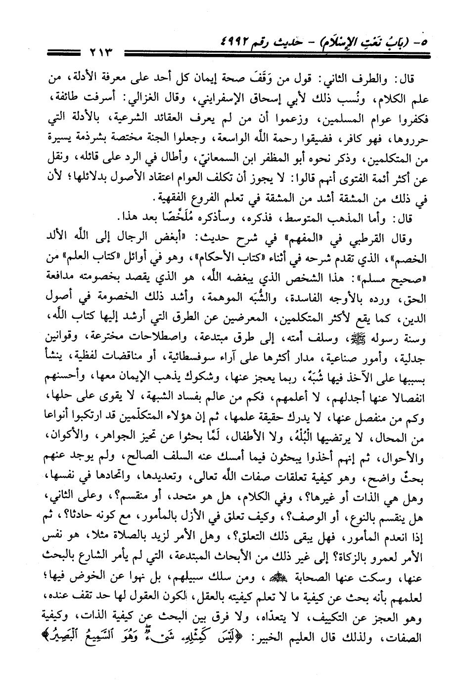 وَقَالَ القرطبيّ فِي "المفهم" فِي شرح حديث: "أبغض الرجال إلى الله الألد الخصم"، الذي تقدم شرحه فِي أثناء "كتاب الأحكام"، وهو فِي أوائل "كتاب العلم" منْ "صحيح مسلم": هَذَا الشخص الذي يبغضه الله، هو الذي يقصد بخصومته مدافعة الحق، ورده بالأوجه الفاسدة، والشُّبَه الموهمة، وأشد ذلك الخصومة فِي أصول الدين، كما يقع لأكثر المتكلمين، المعرضين عن الطرق التي أرشد إليها كتاب الله، وسنة رسوله -صلى الله عليه وسلم-، وسلف أمته، إلى طرق مبتدعة، واصطلاحات مخترعة، وقوانين جدلية، وأمور صناعية، مدار أكثرها عَلَى آراء سوفسطائية، أو مناقضات لفظية، ينشأ بسببها عَلَى الآخذ فيها شُبَهٌ، ربما يعجز عنها، وشكوك يذهب الايمان معها، وأحسنهم انفصالا عنها أجدلهم، لا أعلمهم، فكم منْ عالم بفساد الشبهة، لا يقوى عَلَى حلها، وكم منْ منفصل عنها، لا يدرك حقيقة علمها، ثم إن هؤلاء المتكلّمين قد ارتكبوا أنواعا منْ المحال، لا يرتضيها الْبُلْهُ، ولا الأطفال، لَمَّا بحثوا عن تحيز الجواهر، والأكوان، والأحوال، ثم إنهم أخذوا يبحثون فيما أمسك عنه السلف الصالح، ولم يوجد عنهم بحثٌ واضح، وهو كيفية تعلقات صفات الله تعالى، وتعديدها، واتحادها فِي نفسها، وهل هي الذات أو غيرها؟، وفي الكلام، هل هو متحد، أو منقسم؟، وعلى الثاني، هل ينقسم بالنوع، أو الوصف؟، وكيف تعلق فِي الأزل بالمأمور، مع كونه حادثا؟، ثم إذا انعدم المأمور، فهل يبقى ذلك التعلق؟، وهل الأمر لزيد بالصلاة مثلا، هو نفس الأمر لعمرو بالزكاة؟ إلى غير ذلك منْ الأبحاث المبتدعة، التي لم يأمر الشارع بالبحث عنها، وسكت عنها الصحابة -رضي الله عنهم-، ومن سلك سبيلهم، بل نهوا عن الخوض فيها؛ لعلمهم بأنه بحث عن كيفية ما لا تعلم كيفيته بالعقل، لكون العقول لها حد تقف عنده، وهو العجز عن التكييف، لا يتعدّاه، ولا فرق بين البحث عن كيفية الذات، وكيفية الصفات، ولذلك قَالَ العليم الخبير: {لَيْسَ كَمِثْلِهِ شَيْءٌ وَهُوَ السَّمِيعُ الْبَصِيرُ}