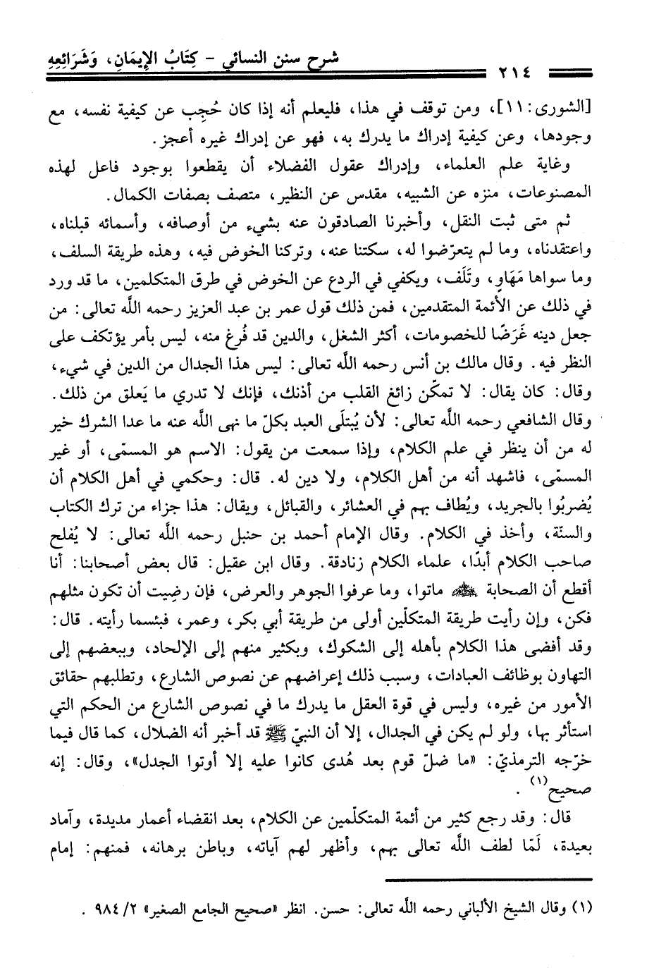 ثم متى ثبت النقل، وأخبرنا الصادقون عنه بشيء منْ أوصافه، وأسمائه قبلناه، واعتقدناه، وما لم يتعرّضوا له، سكتنا عنه، وتركنا الخوض فيه، وهذه طريقة السلف، وما سواها مَهَاوٍ، وتَلَف، ويكفي فِي الردع عن الخوض فِي طرق المتكلمين، ما قد ورد فِي ذلك عن الأئمة المتقدمين، فمن ذلك قول عمر بن عبد العزيز رحمه الله تعالى: منْ جعل دينه غَرَضًا للخصومات، أكثر الشغل، والدين قد فُرغ منه، ليس بأمر يؤتكف عَلَى النظر فيه. وَقَالَ مالك بن أنس رحمه الله تعالى: ليس هَذَا الجدال منْ الدين فِي شيء، وَقَالَ: كَانَ يقال: لا تمكّن زائغ القلب منْ أذنك، فإنك لا تدري ما يَعلق منْ ذلك. وَقَالَ الشافعيّ رحمه الله تعالى: لأن يُبتلَى العبد بكلّ ما نهى الله عنه ما عدا الشرك خير له منْ أن ينظر فِي علم الكلام، وإذا سمعت منْ يقول: الاسم هو المسمّى، أو غير المسمّى، فاشهد أنه منْ أهل الكلام، ولا دين له. قَالَ: وحكمي فِي أهل الكلام أن يُضربُوا بالجريد، ويُطاف بهم فِي العشائر، والقبائل، ويقال: هَذَا جزاء منْ ترك الكتاب والسنّة، وأخذ فِي الكلام. وَقَالَ الإمام أحمد بن حنبل رحمه الله تعالى: لا يُفلح صاحب الكلام أبدًا، علماء الكلام زنادقة. وَقَالَ ابن عقيل: قَالَ بعض أصحابنا: أنا أقطع أن الصحابة -رضي الله عنهم- ماتوا، وما عرفوا الجوهر والعرض، فإن رضِيت أن تكون مثلهم فكن، وإن رأيت طريقة المتكلّين أولى منْ طريقة أبي بكر، وعمر، فبئسما رأيته. قَالَ: وَقَدْ أفضى هَذَا الكلام بأهله إلى الشكوك، وبكثير منهم إلى الإلحاد، وببعضهم إلى التهاون بوظائف العبادات، وسبب ذلك إعراضهم عن نصوص الشارع، وتطلبهم حقائق الأمور منْ غيره، وليس فِي قوة العقل ما يدرك ما فِي نصوص الشارع منْ الحكم التي استأثر بها، ولو لم يكن فِي الجدال، إلا أن النبيّ -صلى الله عليه وسلم- قد أخبر أنه الضلال، كما قَالَ فيما خرّجه الترمذيّ: "ما ضلّ قوم بعد هُدى كانوا عليه إلا أوتوا الجدل"، وَقَالَ: إنه صحيح (¬1).
