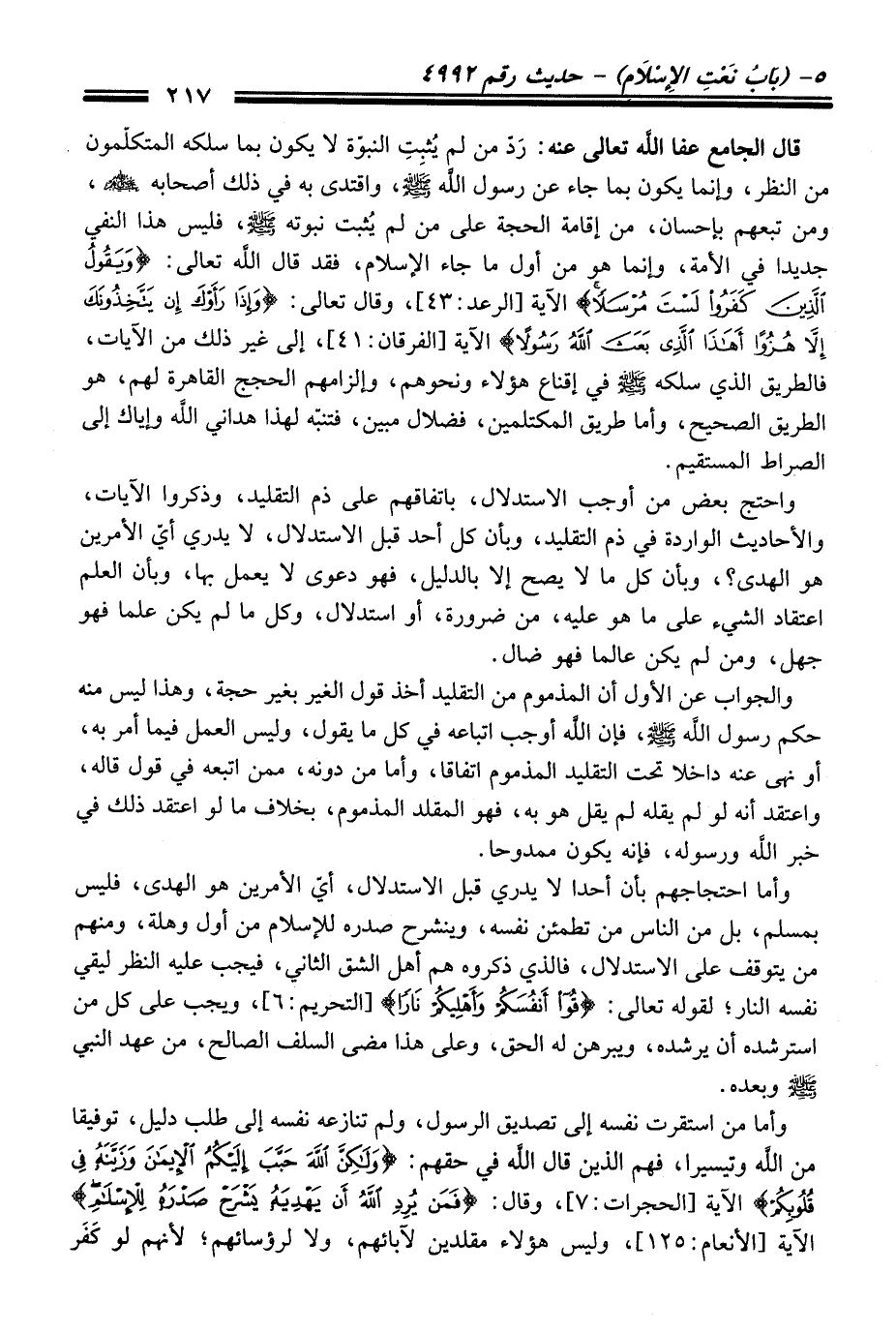 وأما احتجاجهم بأن أحدا لا يدري قبل الاستدلال، أيّ الأمرين هو الهدى، فليس بمسلم، بل منْ النَّاس منْ تطمئن نفسه، وينشرح صدره للإسلام منْ أول وهلة، ومنهم منْ يتوقف عَلَى الاستدلال، فالذي ذكروه هم أهل الشق الثاني، فيجب عليه النظر ليقي نفسه النار؛ لقوله تعالى: {قُوا أَنْفُسَكُمْ وَأَهْلِيكُمْ نَارًا} [التحريم: 6]، ويجب عَلَى كل منْ استرشده أن يرشده، ويبرهن له الحق، وعلى هَذَا مضى السلف الصالح، منْ عهد النبيّ -صلى الله عليه وسلم- وبعده.